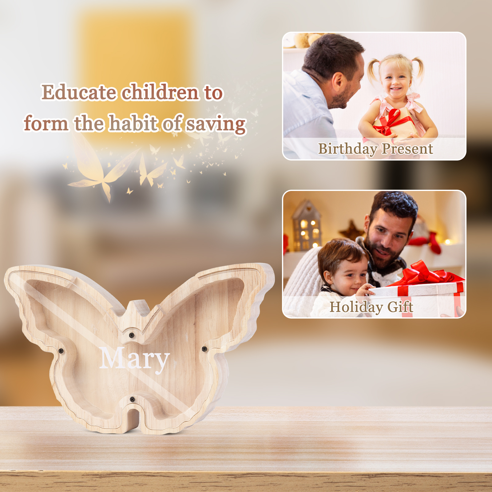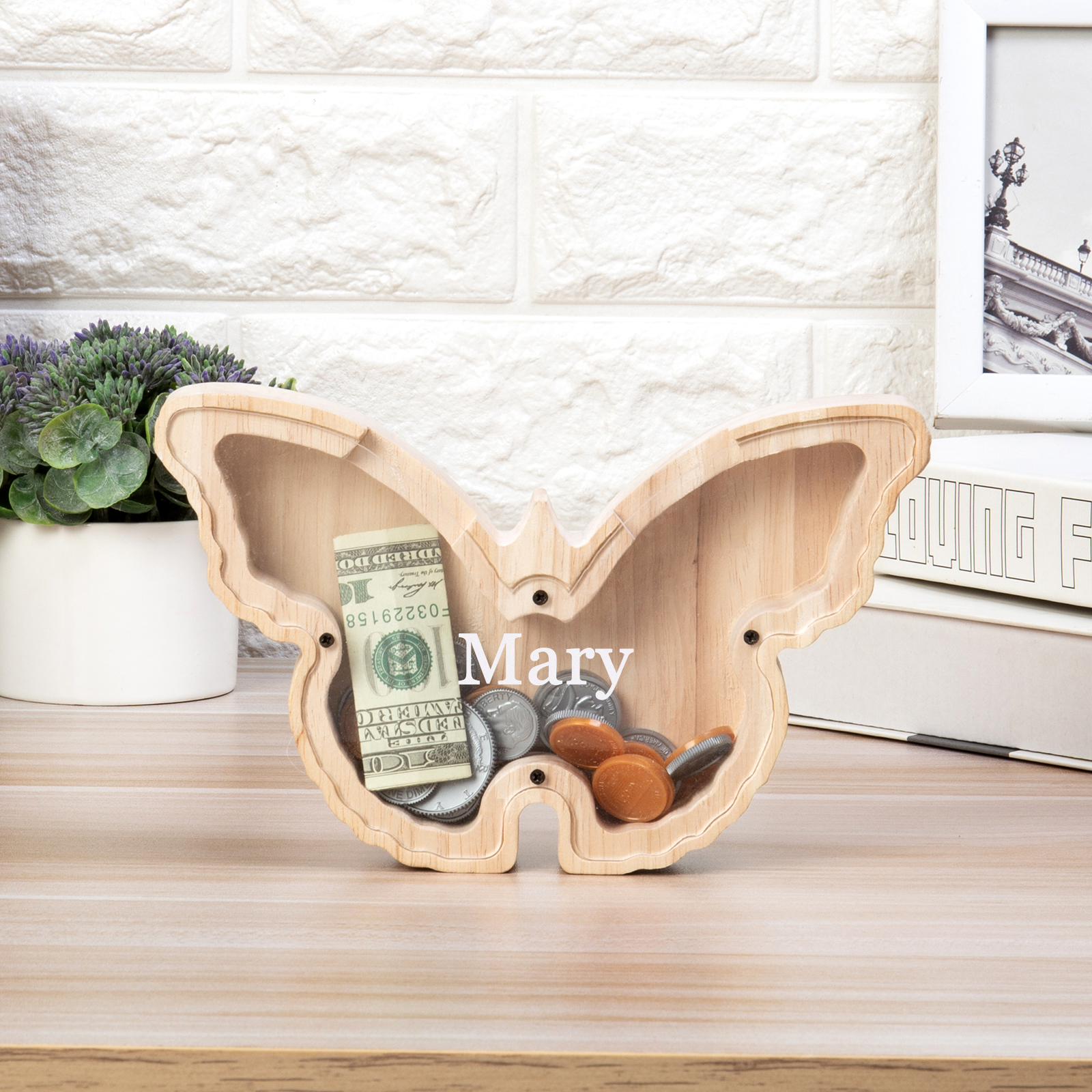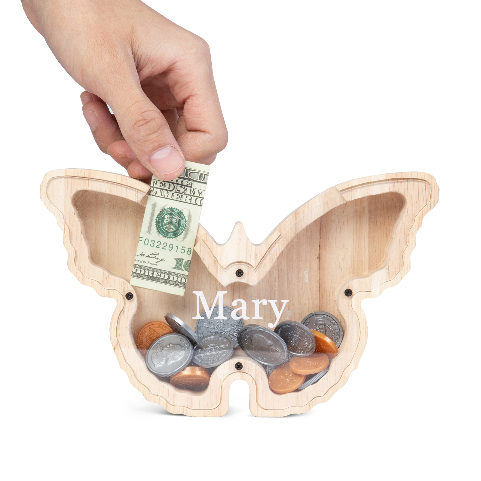 Salvadanaio in legno farfalla personalizzato con 1 nome regalo per i bambini