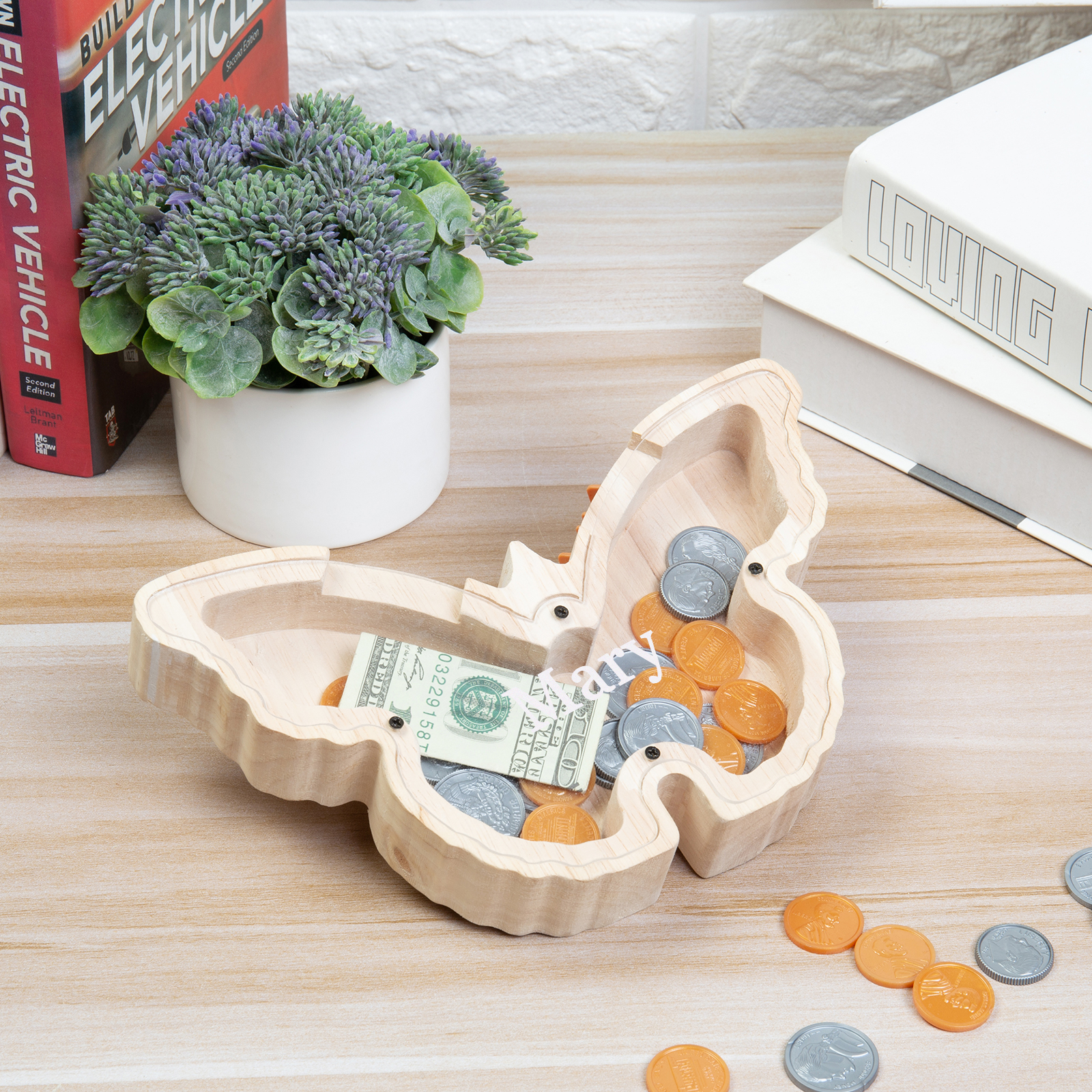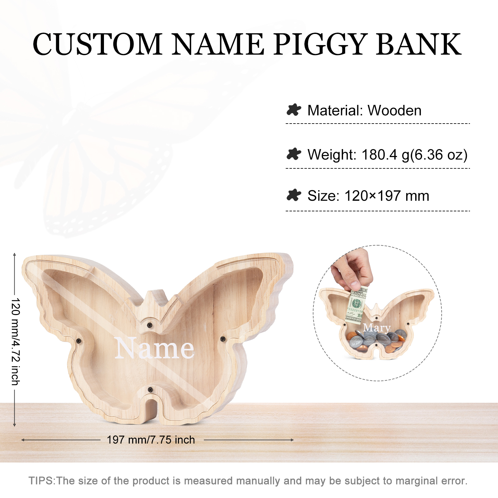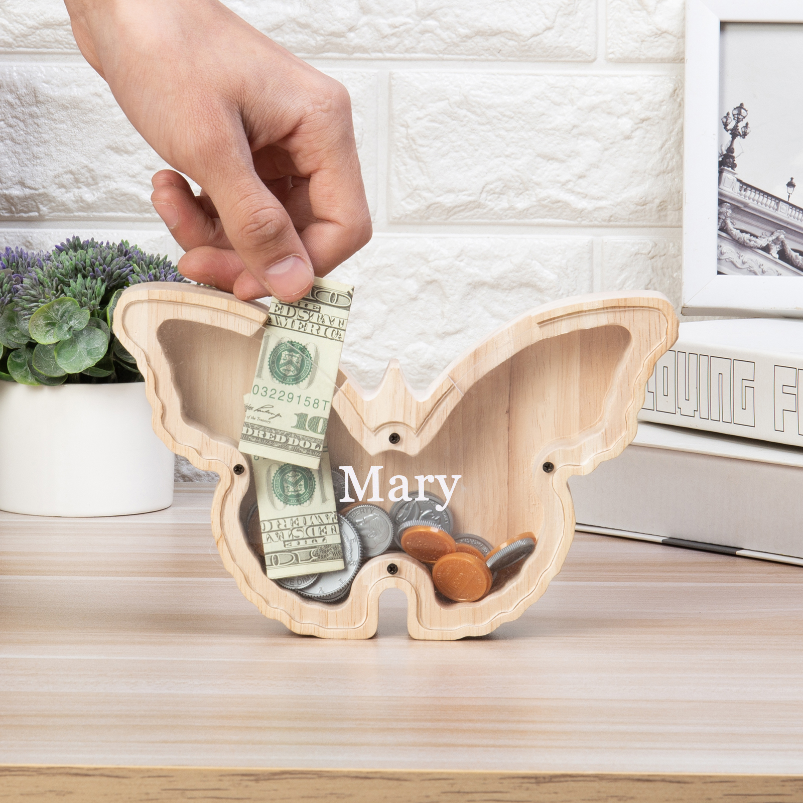 Salvadanaio in legno farfalla personalizzato con 1 nome regalo per i bambini