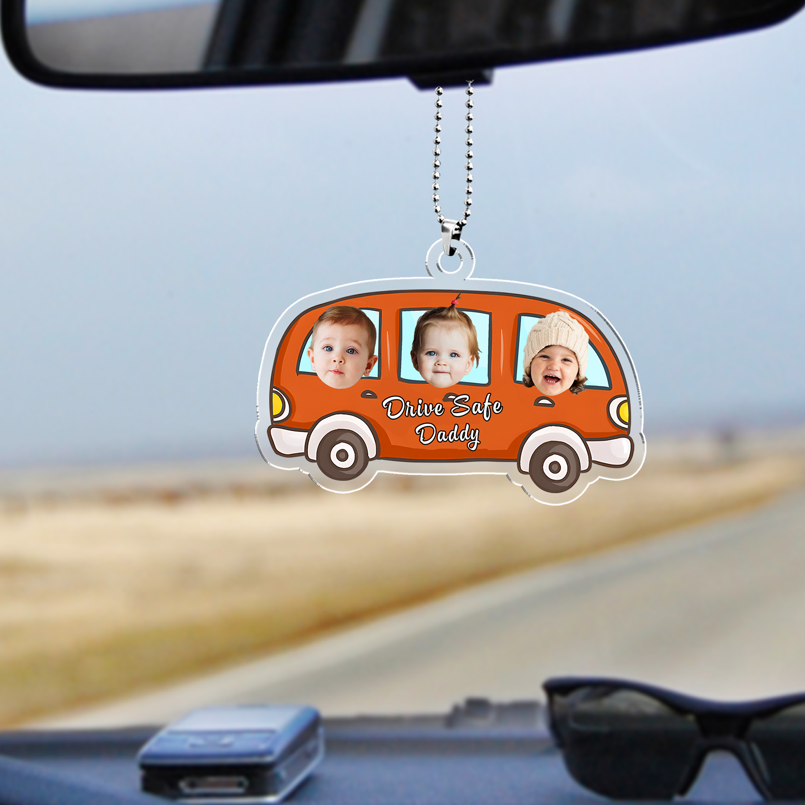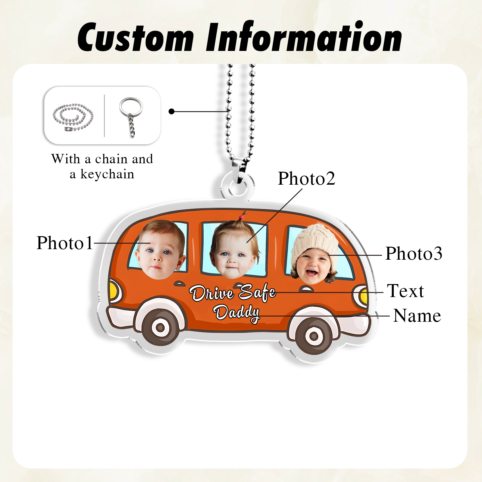 Portachiavi/Pendente macchina personalizzato con 3 foto e 1 testo e 1 nome per bambini