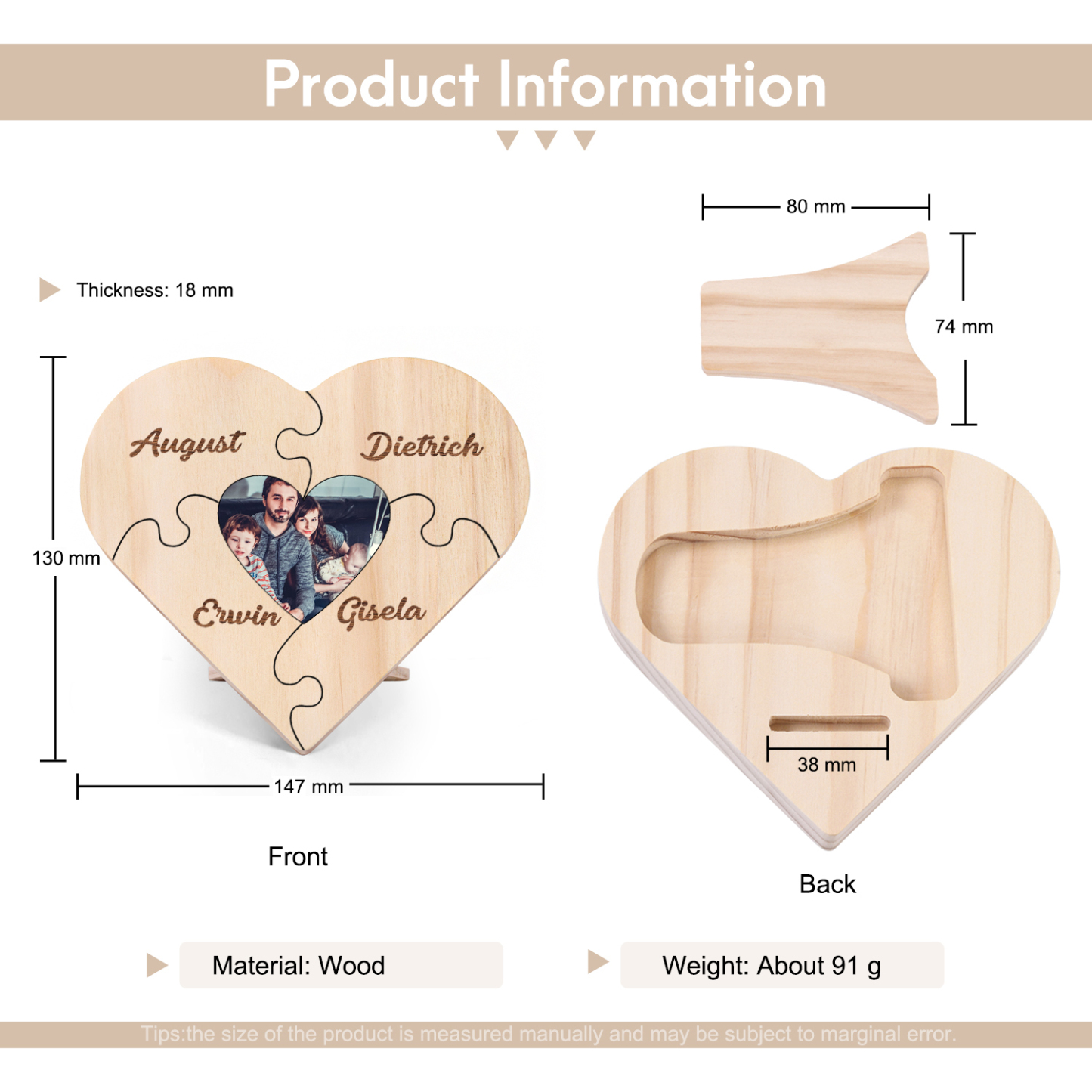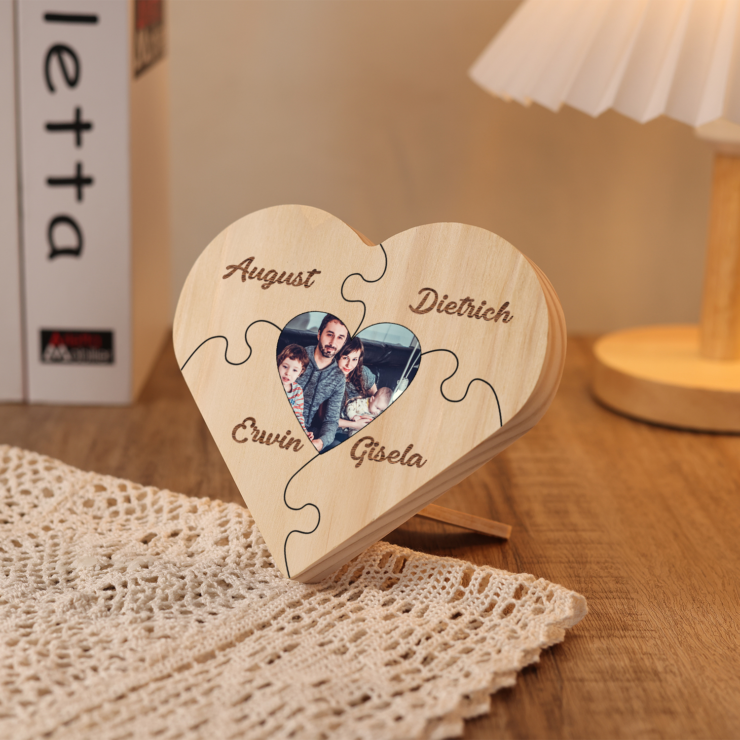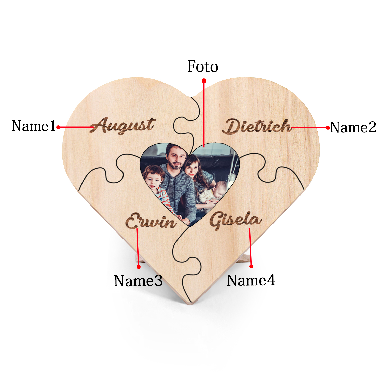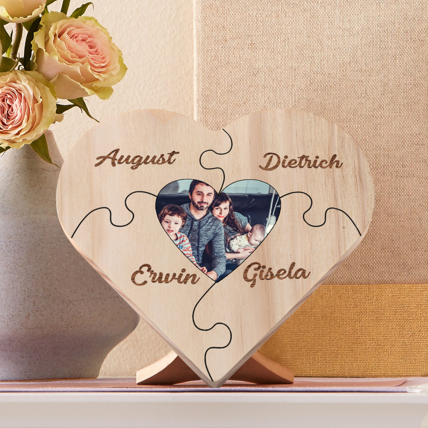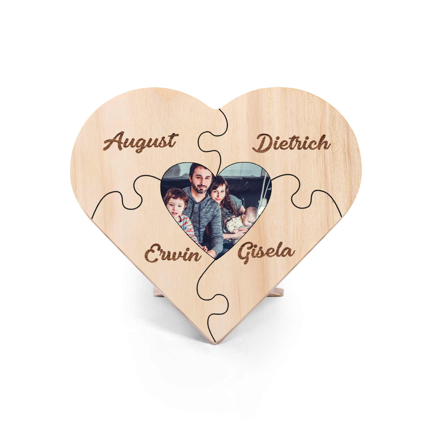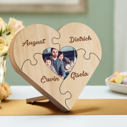 Targa di legno a cuore puzzle per famiglia 4 nomi personalizzabili