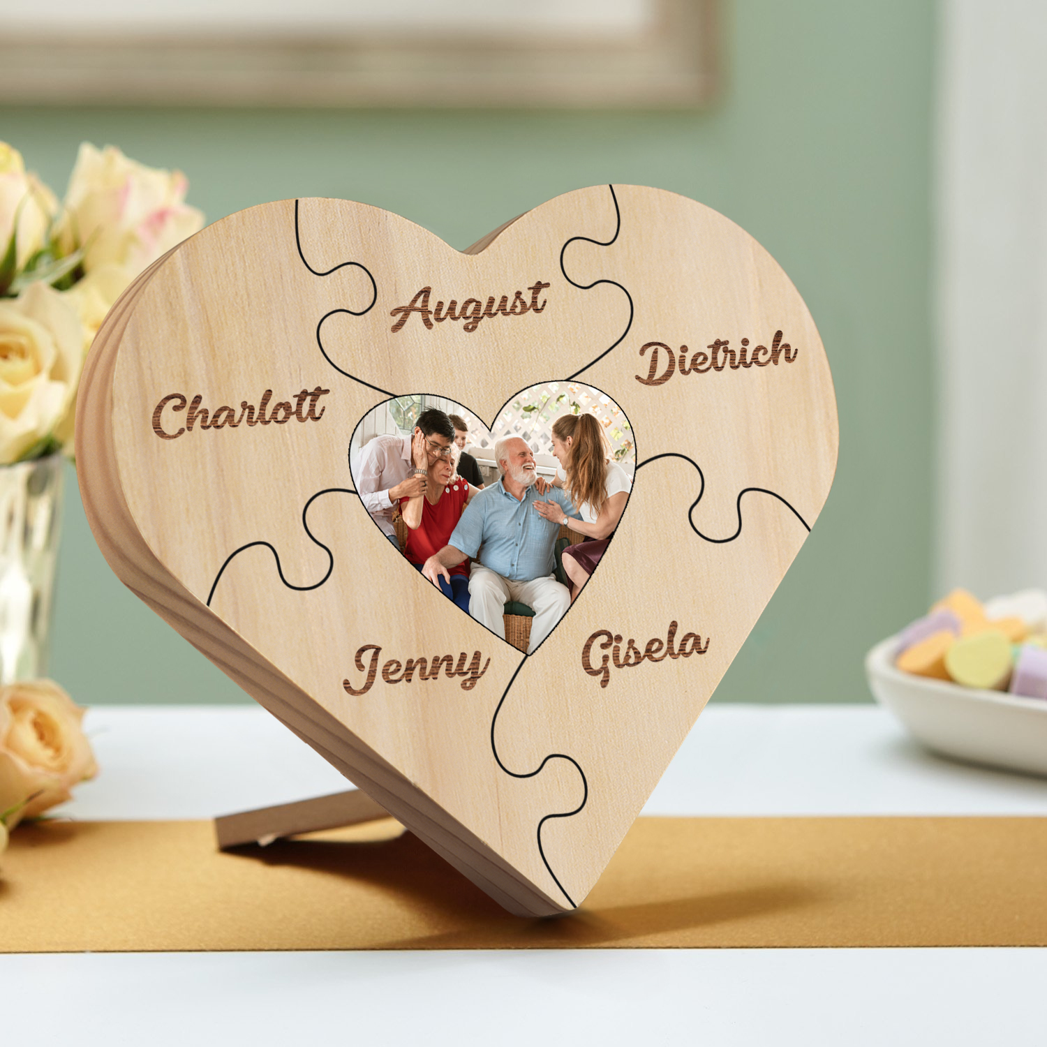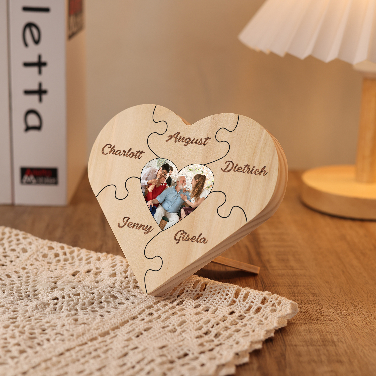Targa di legno a cuore puzzle per famiglia 5 nomi personalizzabili