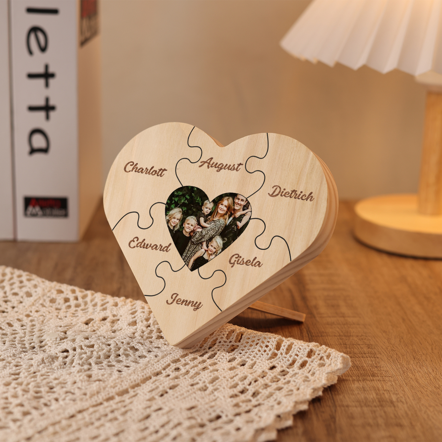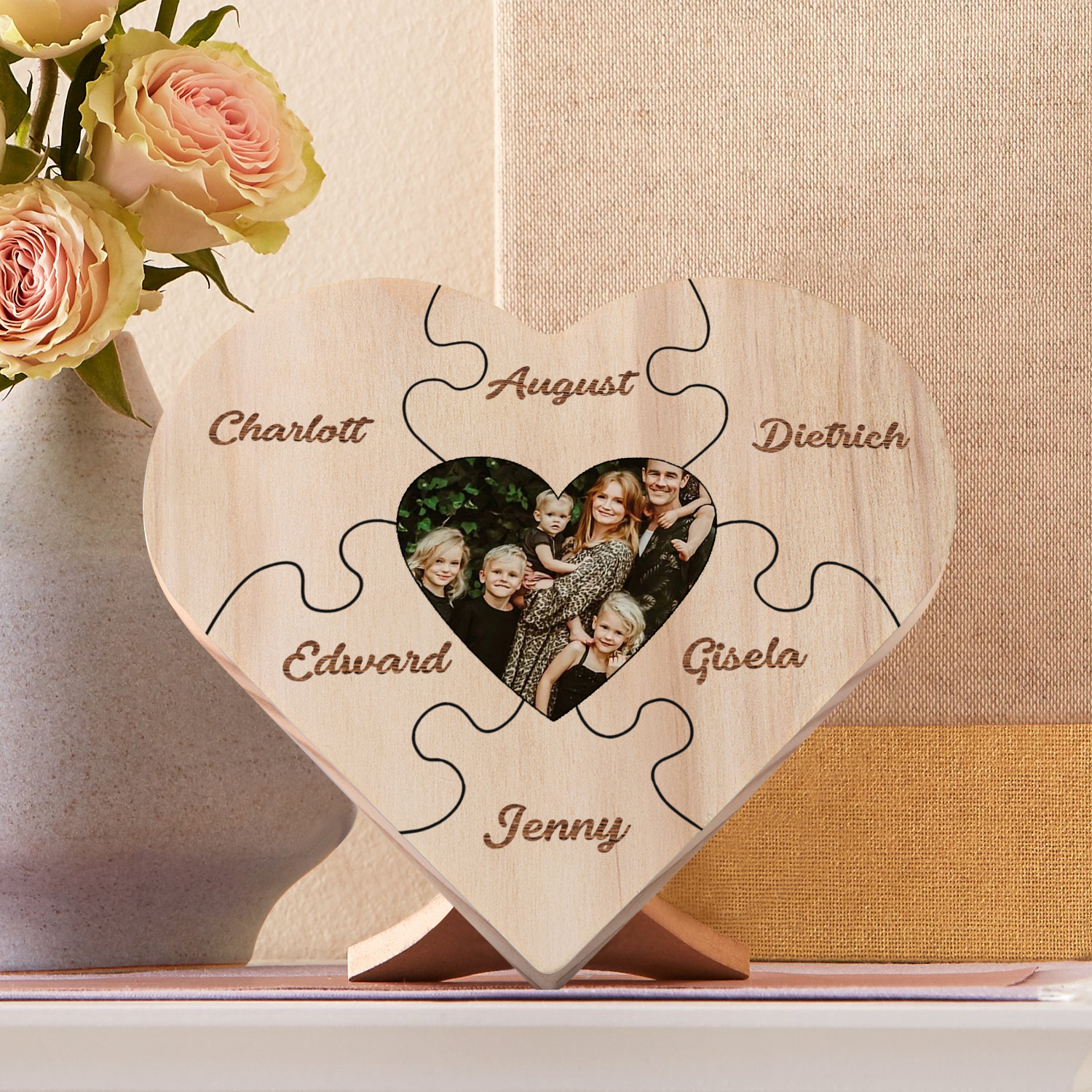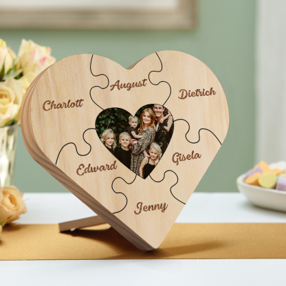 Targa di legno a cuore puzzle per famiglia 6 nomi personalizzabili