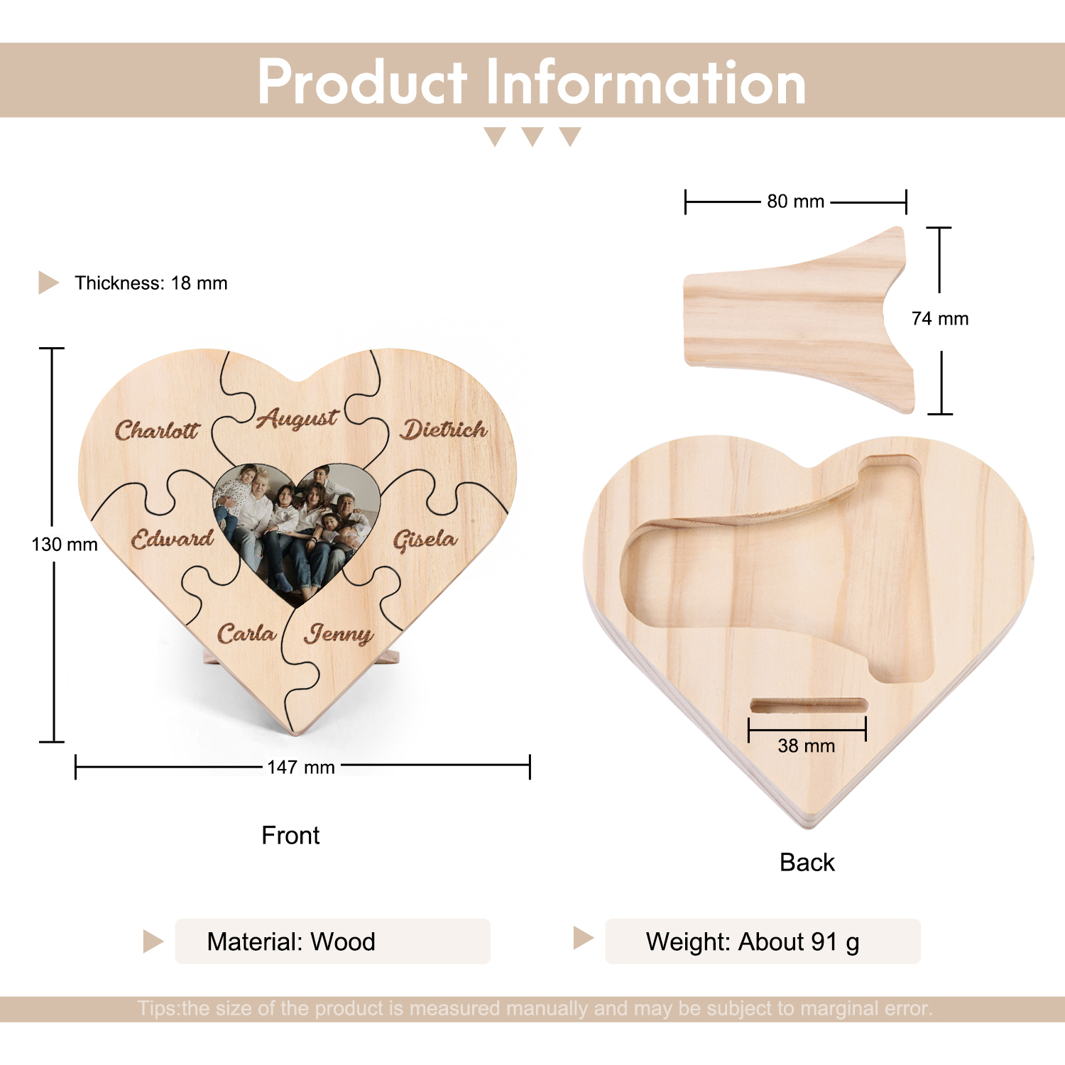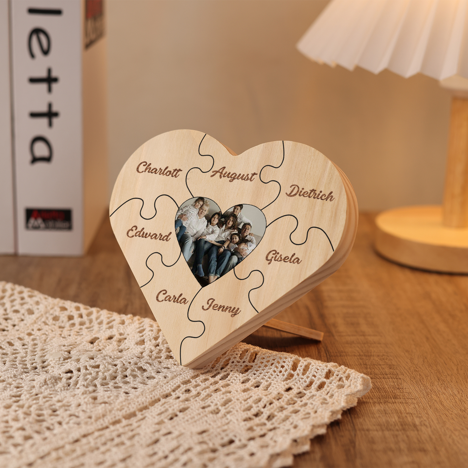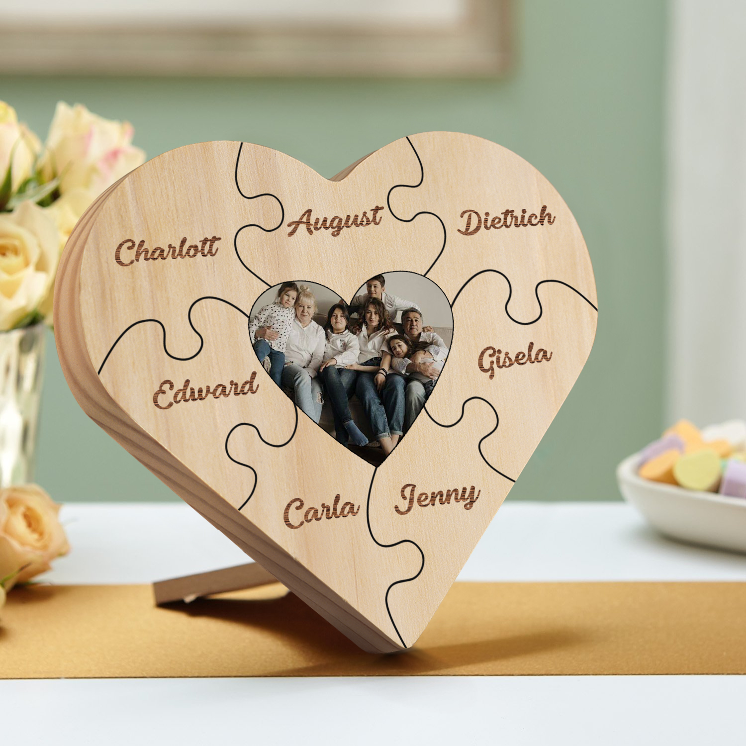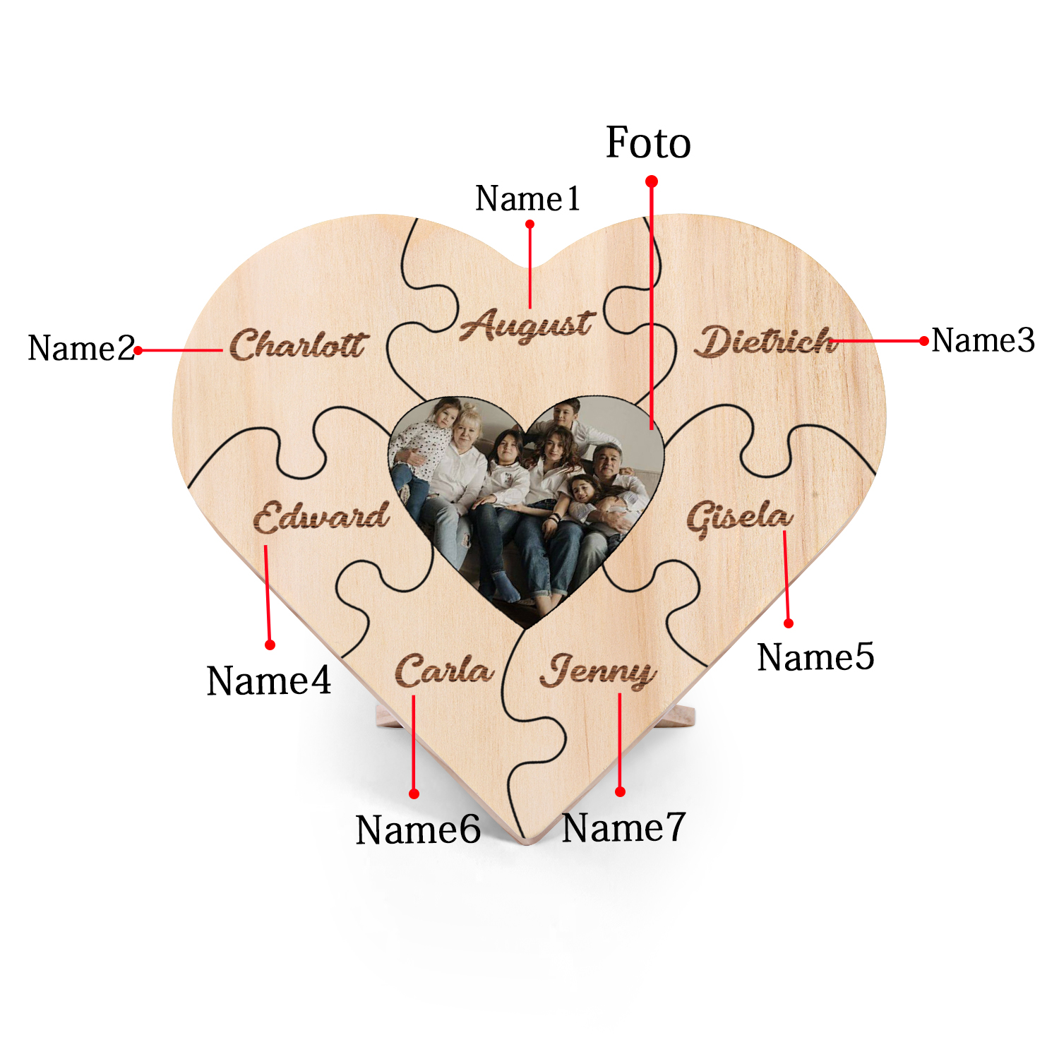 Targa di legno a cuore puzzle per famiglia 7 nomi personalizzabili