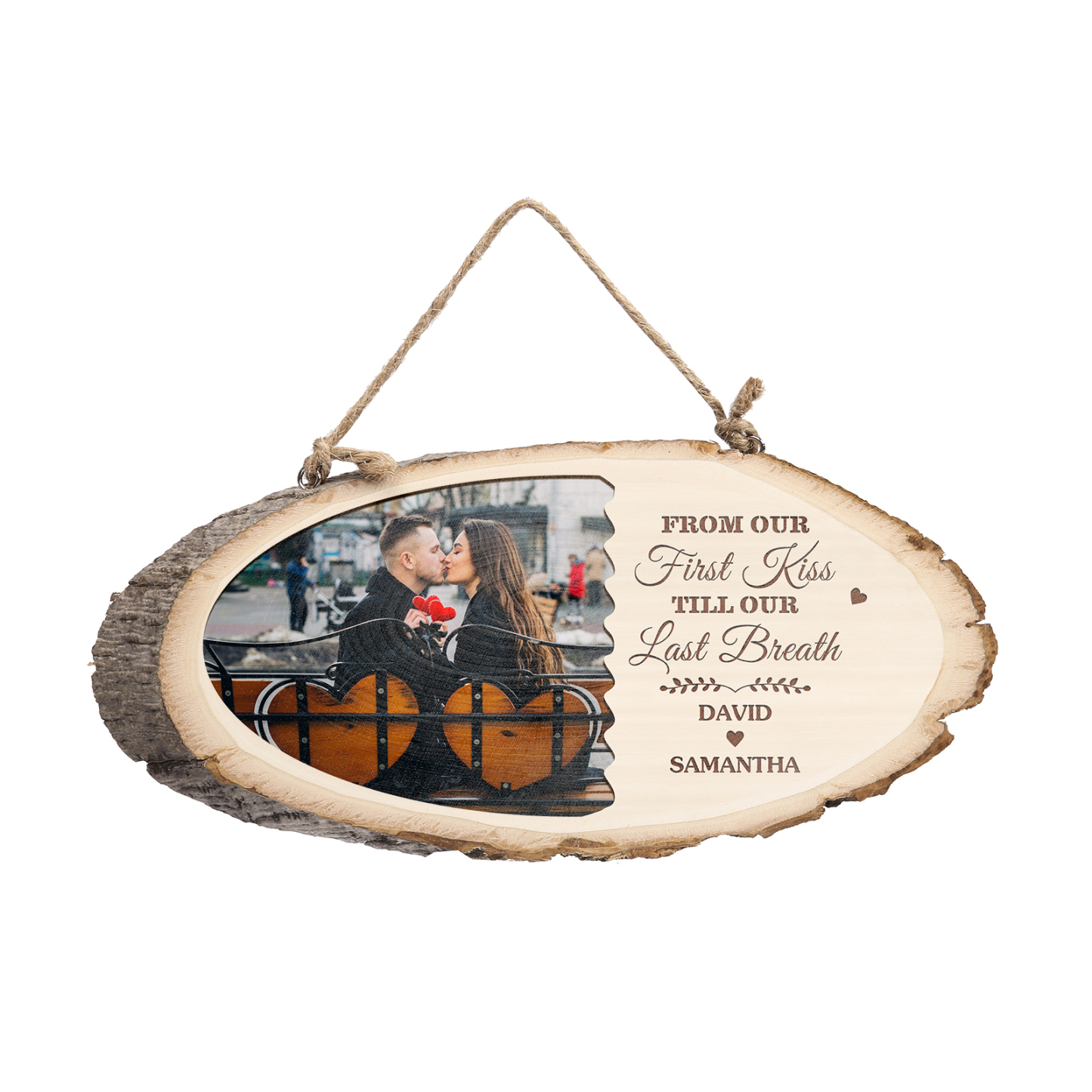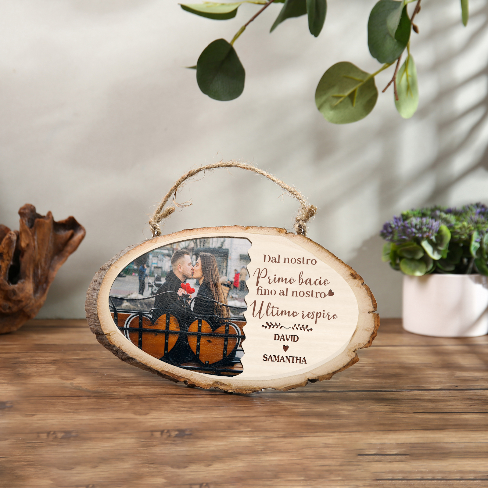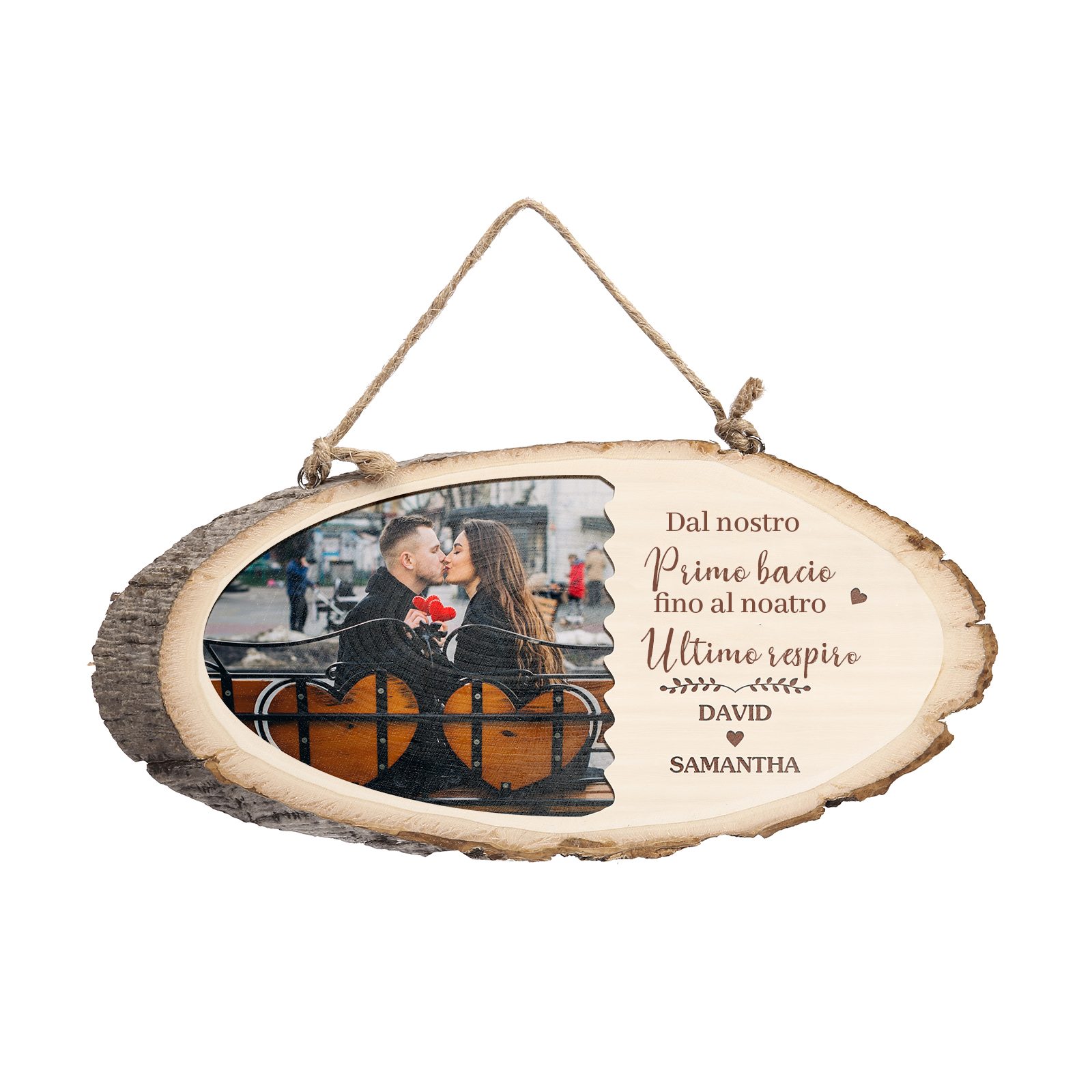 Targa di legno appesa con 2 nomi e 1 foto e 1 testo personalizzabili per coppia