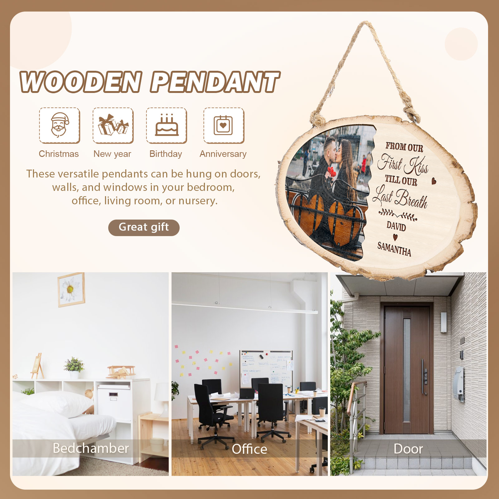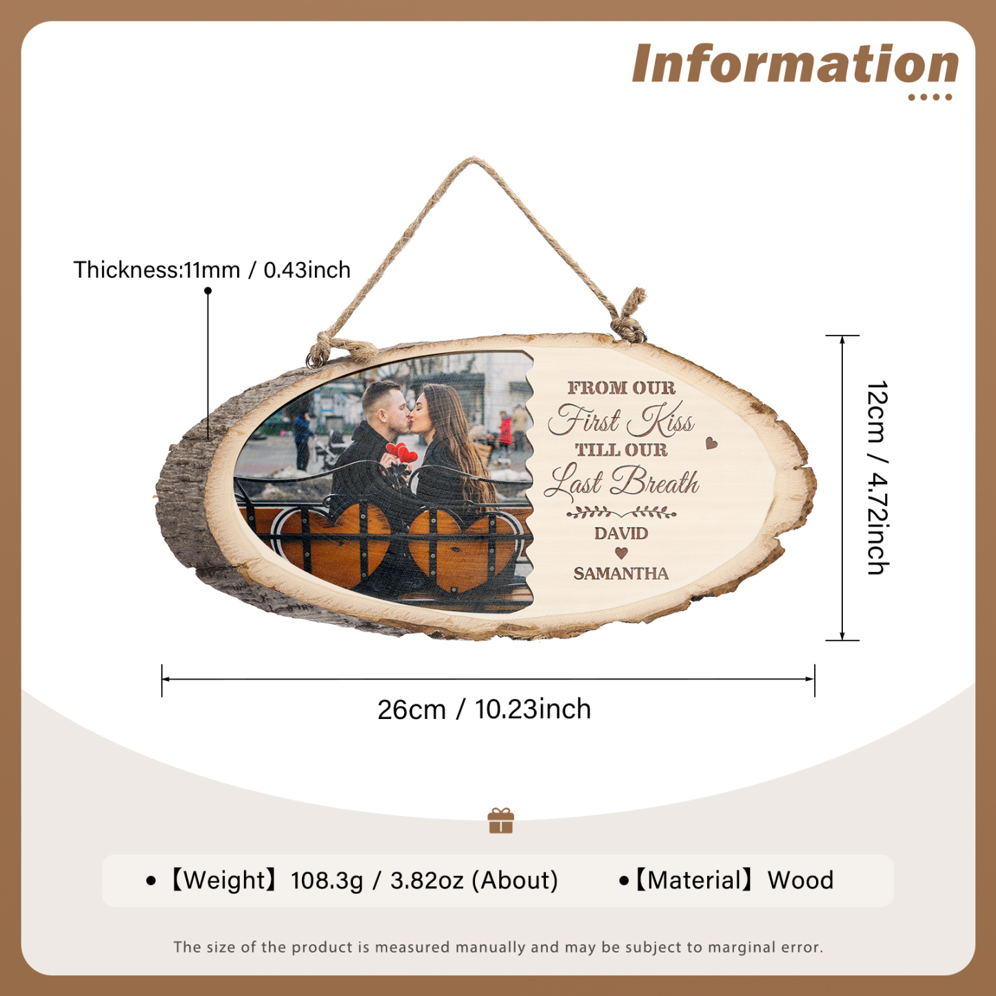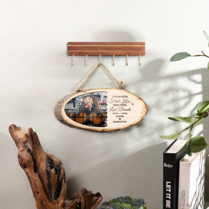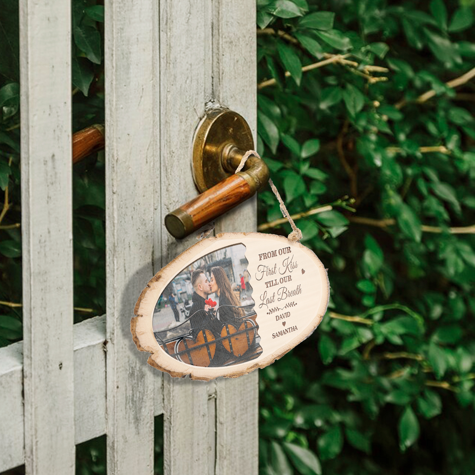 Targa di legno appesa con 2 nomi e 1 foto e 1 testo personalizzabili per coppia