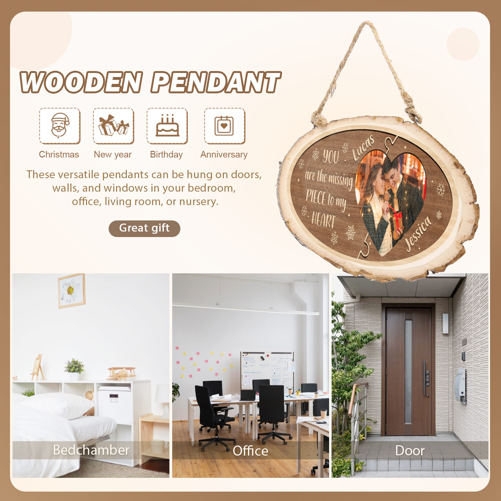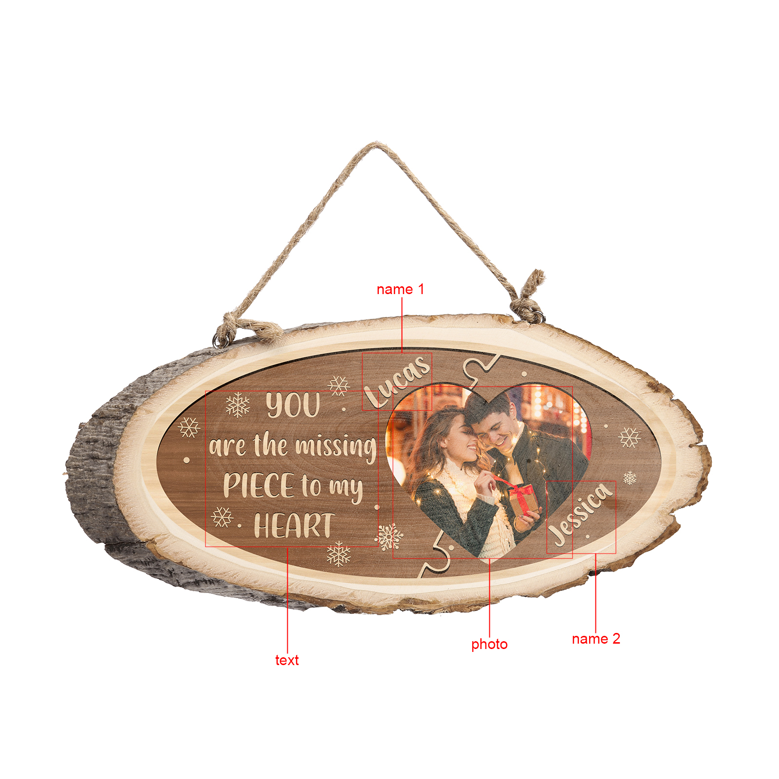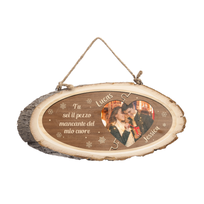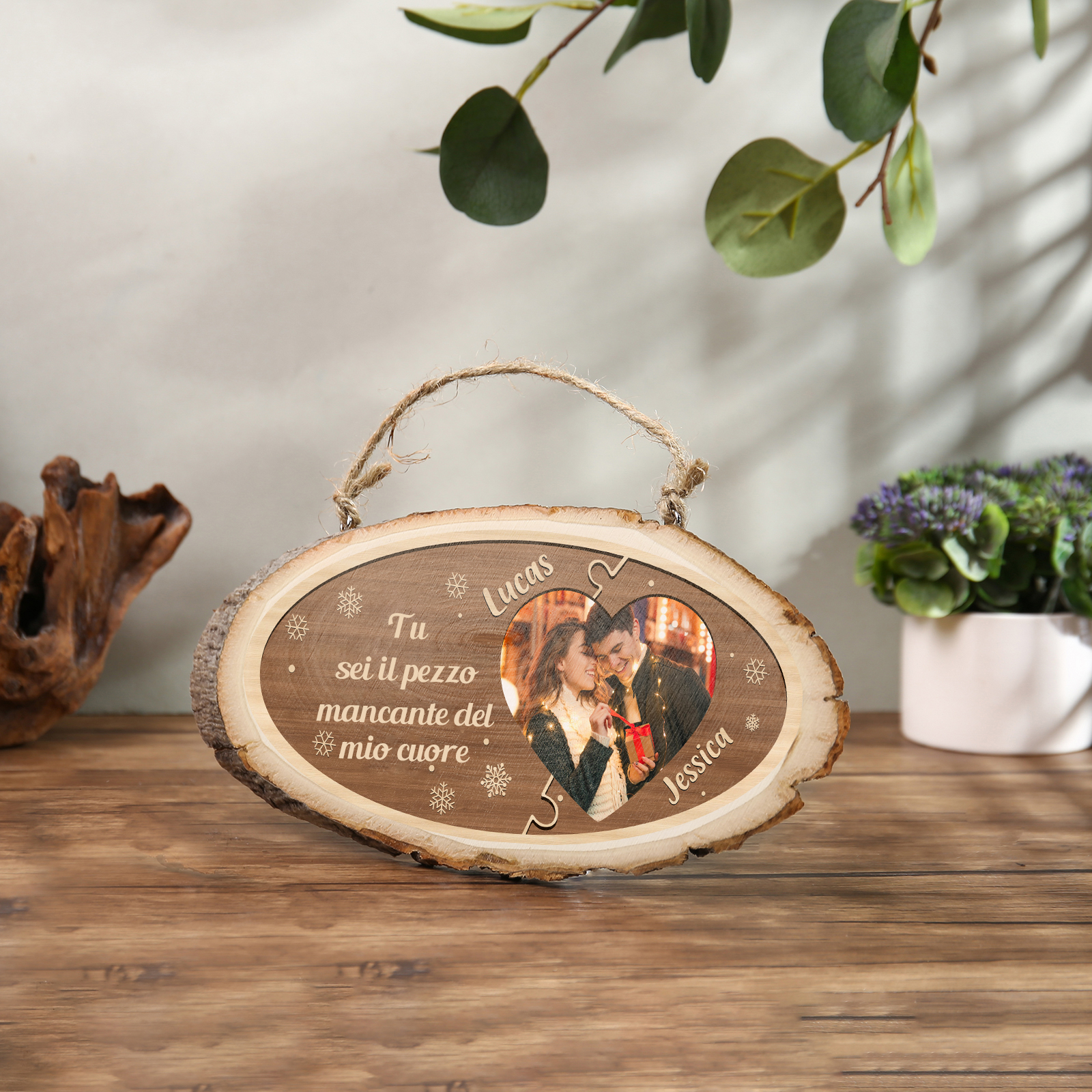 Targa di legno appesa con 2 nomi e 1 foto e 1 testo personalizzabili per coppia