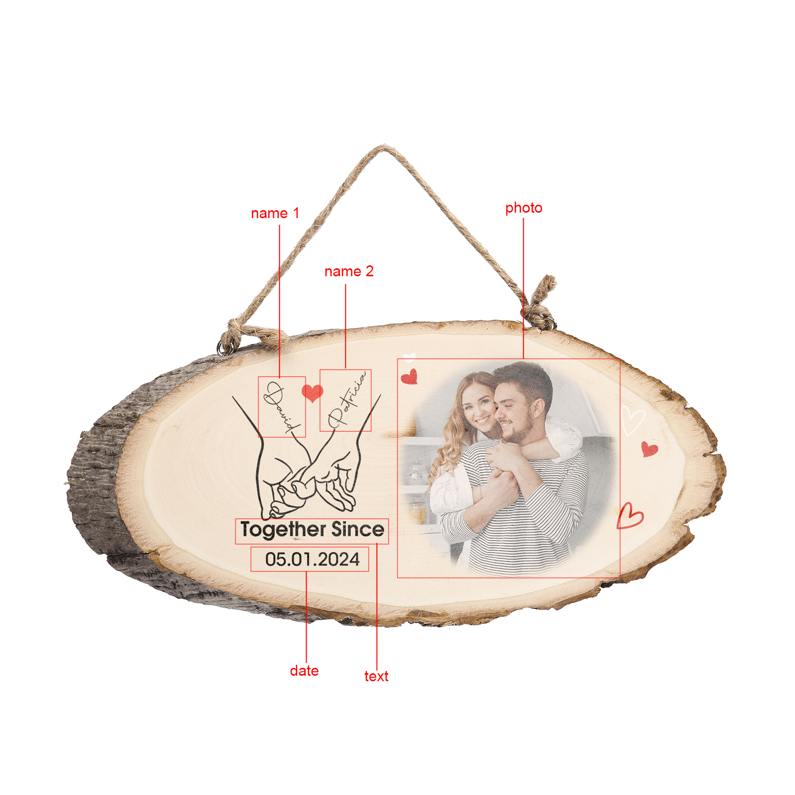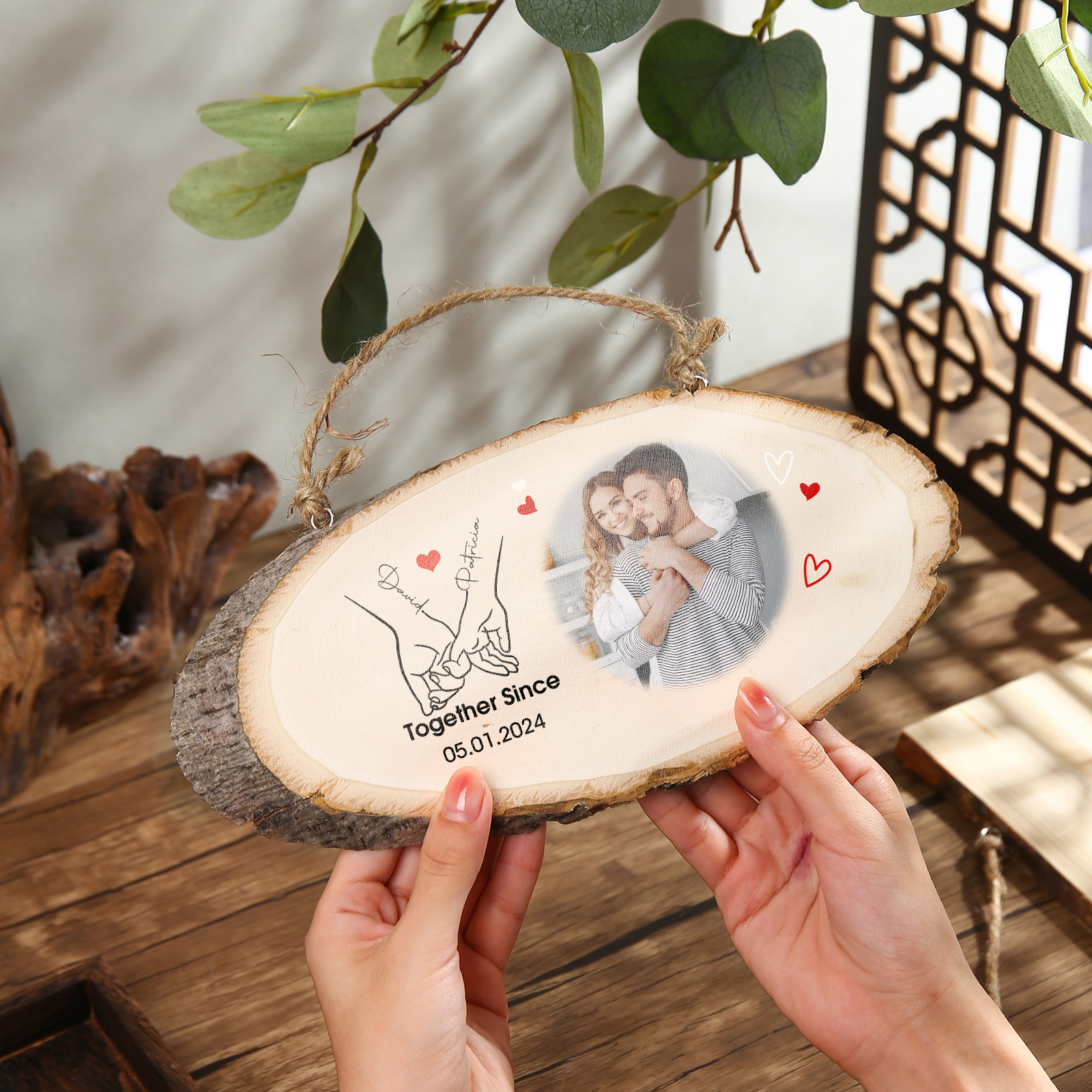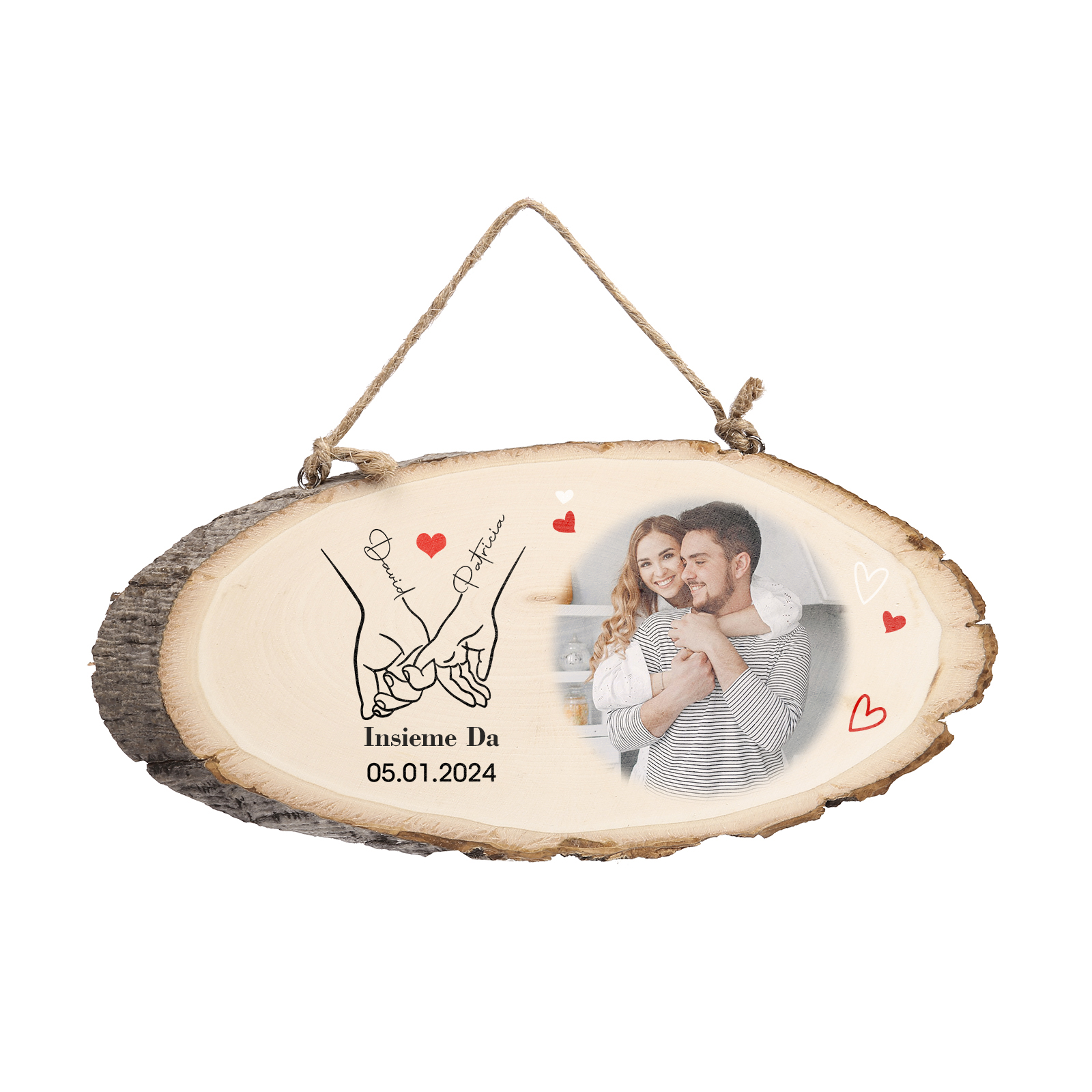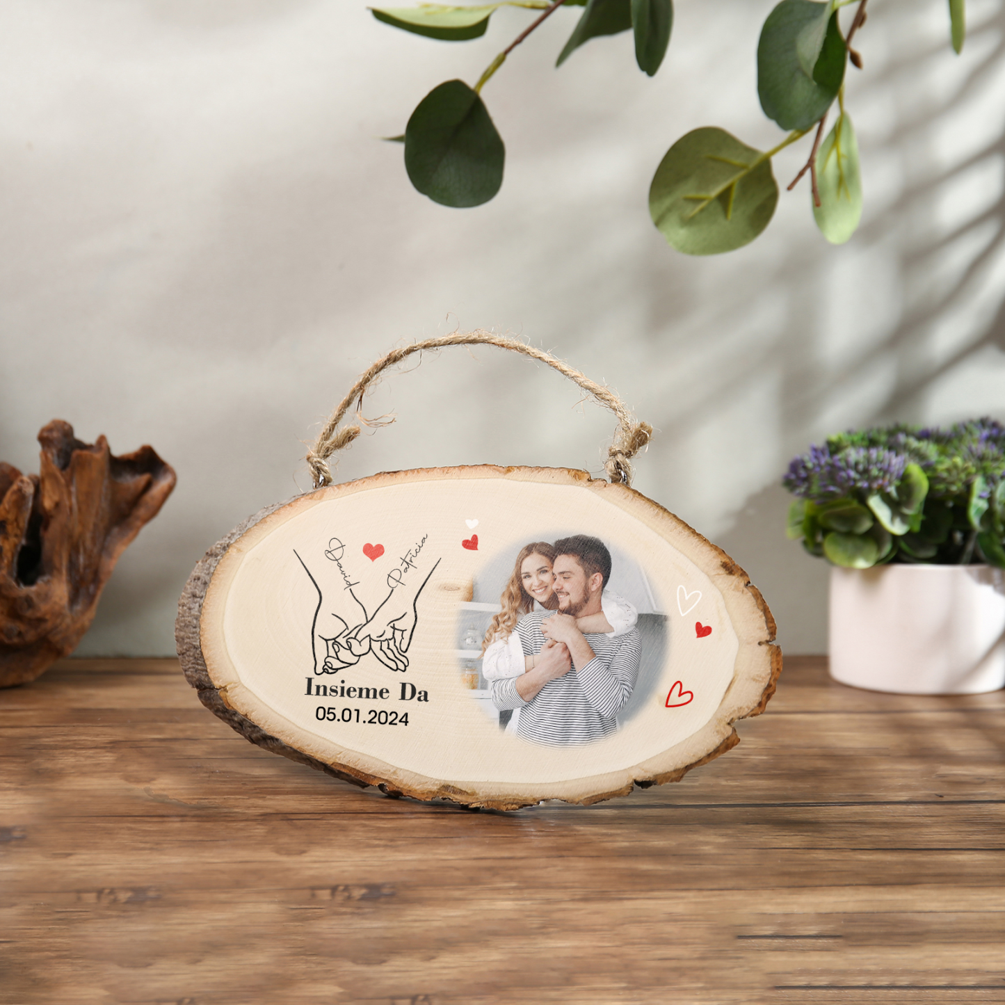 Targa di legno appesa mano nella mano 2 nomi e 1 data e 1 foto e 1 testo personalizzabili per coppia