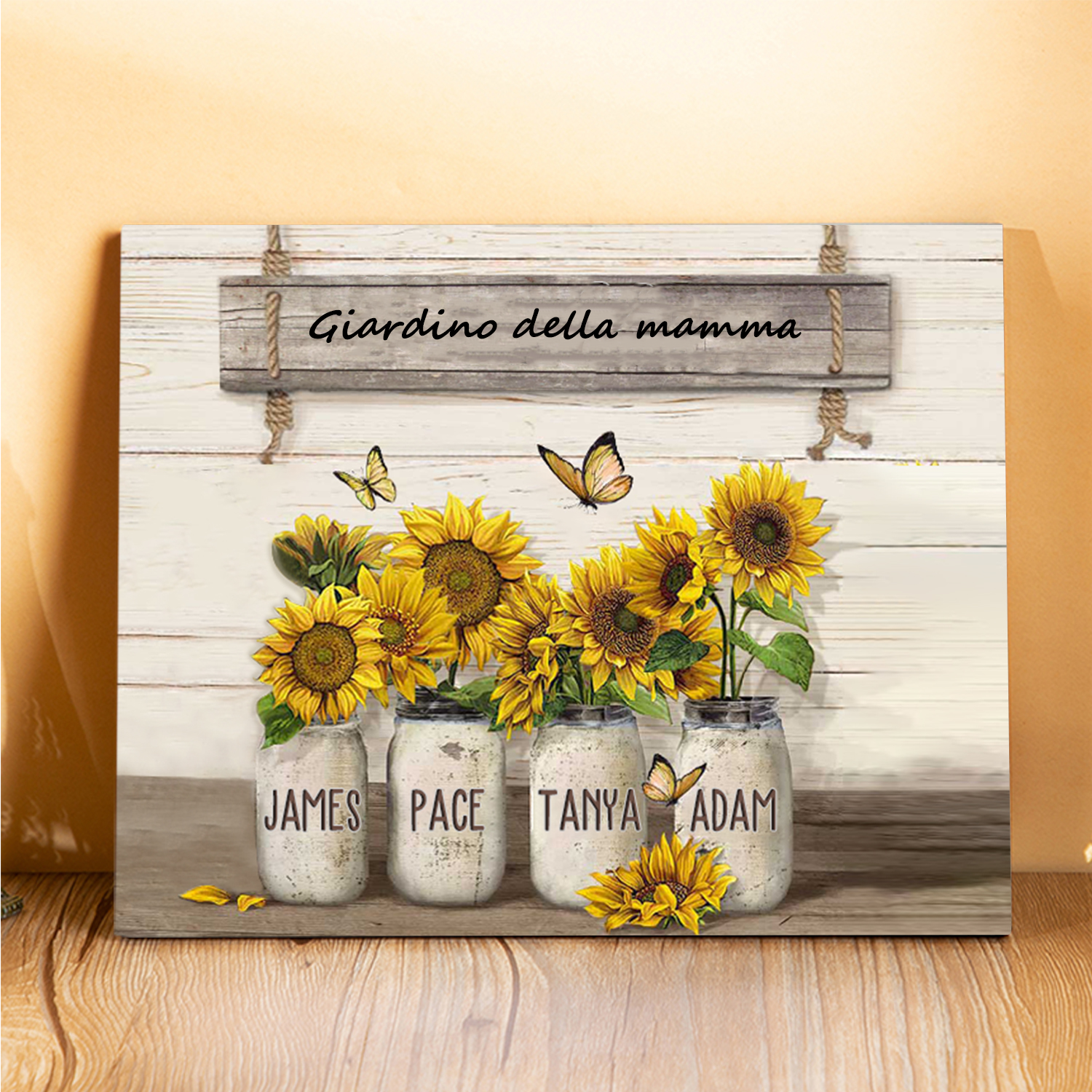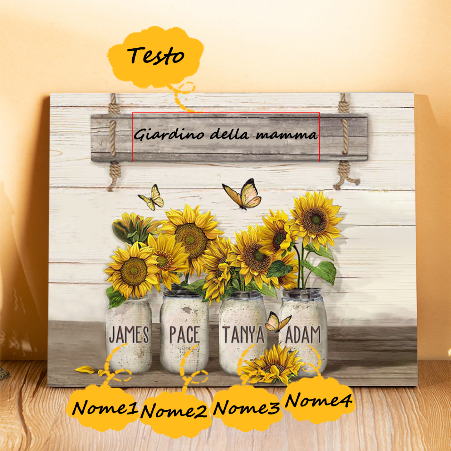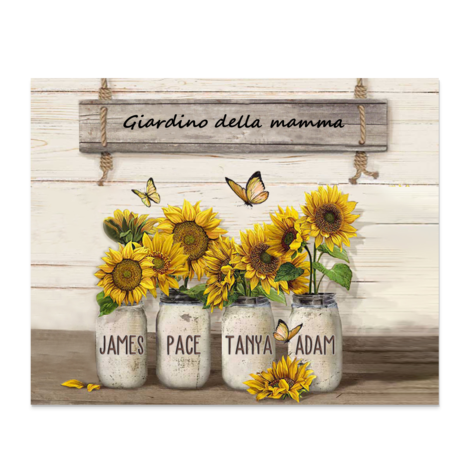 Targa in legno girasole 4 nomi e 1 testo personalizzati regalo Per mamma