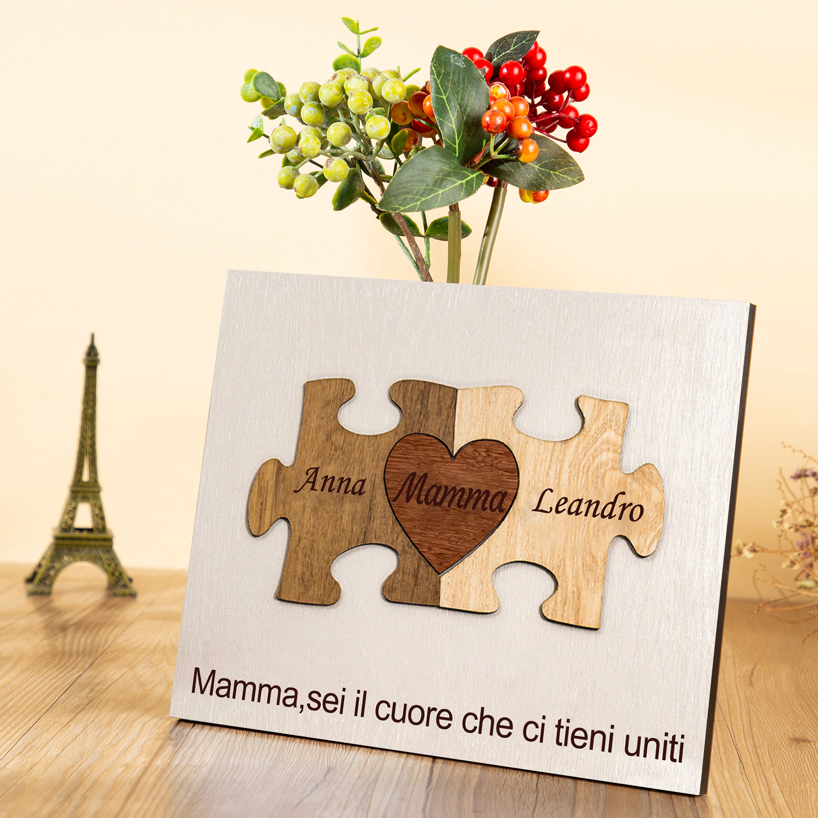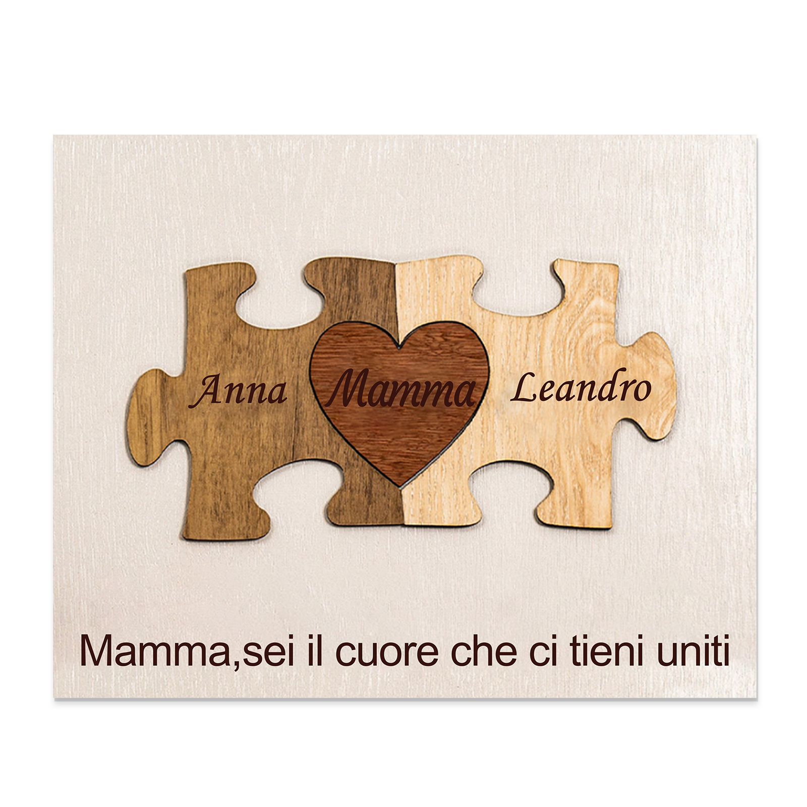 Targa in legno puzzle cuore con 2 nomi e 1 testo personalizzati regalo per mamma