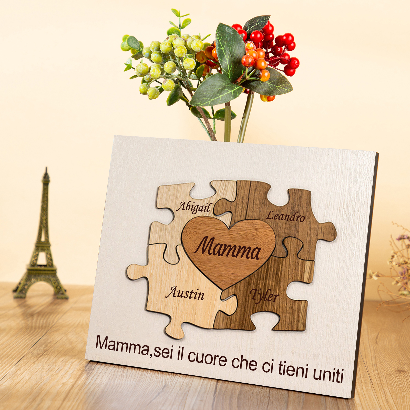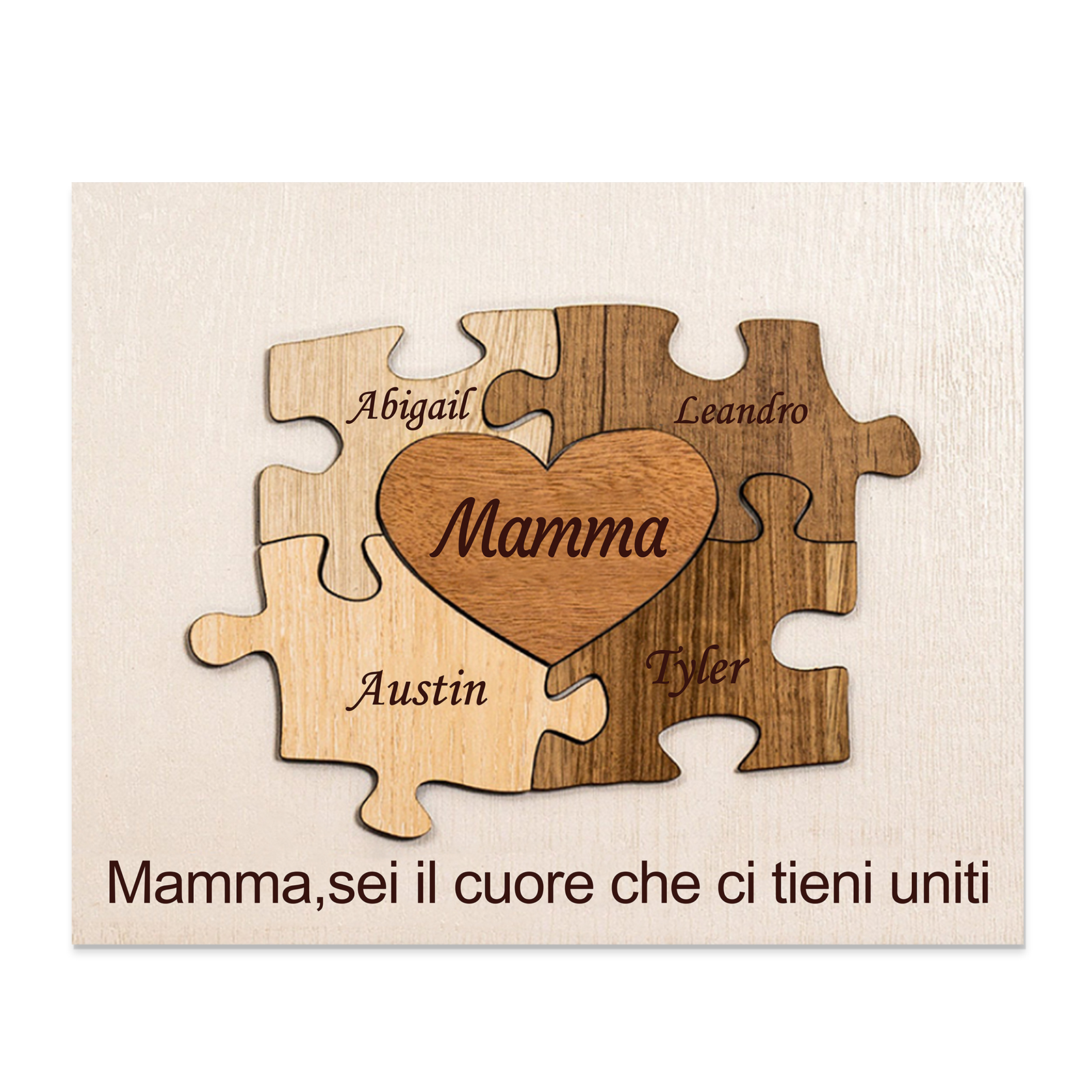 Targa in legno puzzle cuore con 4 nomi e 1 testo personalizzati regalo per mamma