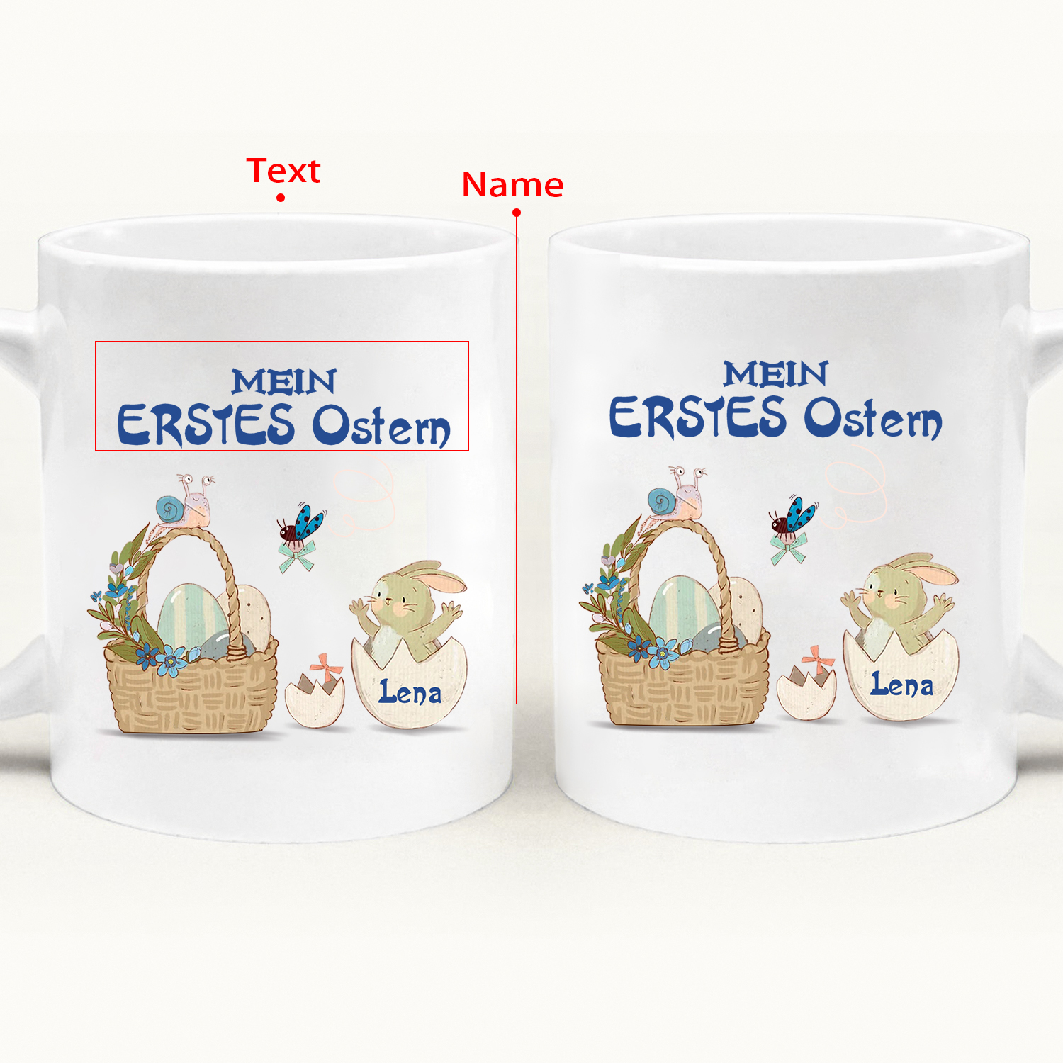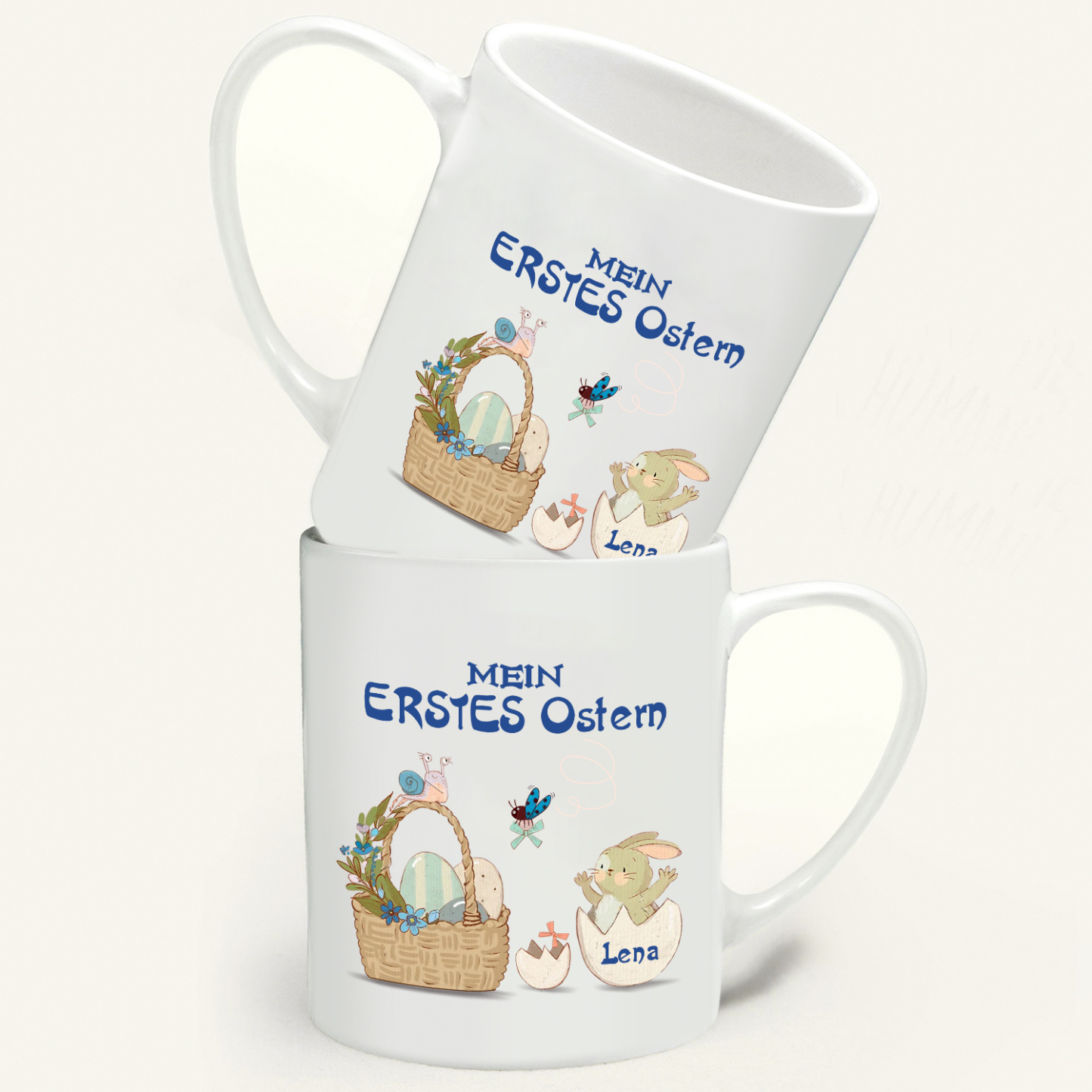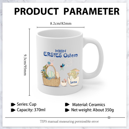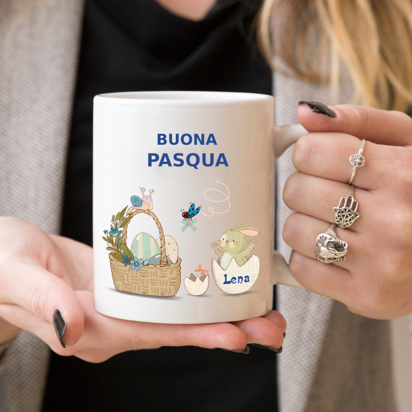 Tazza ceramica con coniglio blu personalizzata con 1 nome e 1 testo per Pasqua