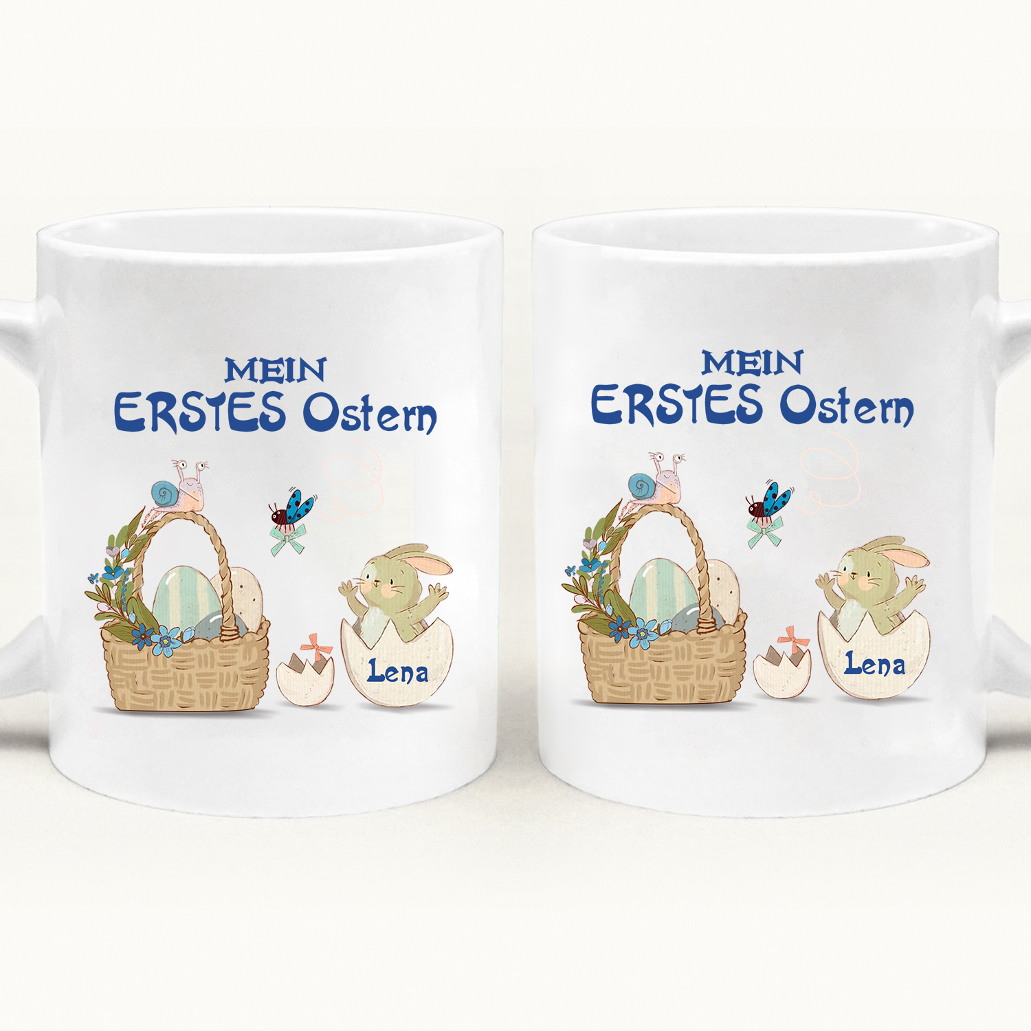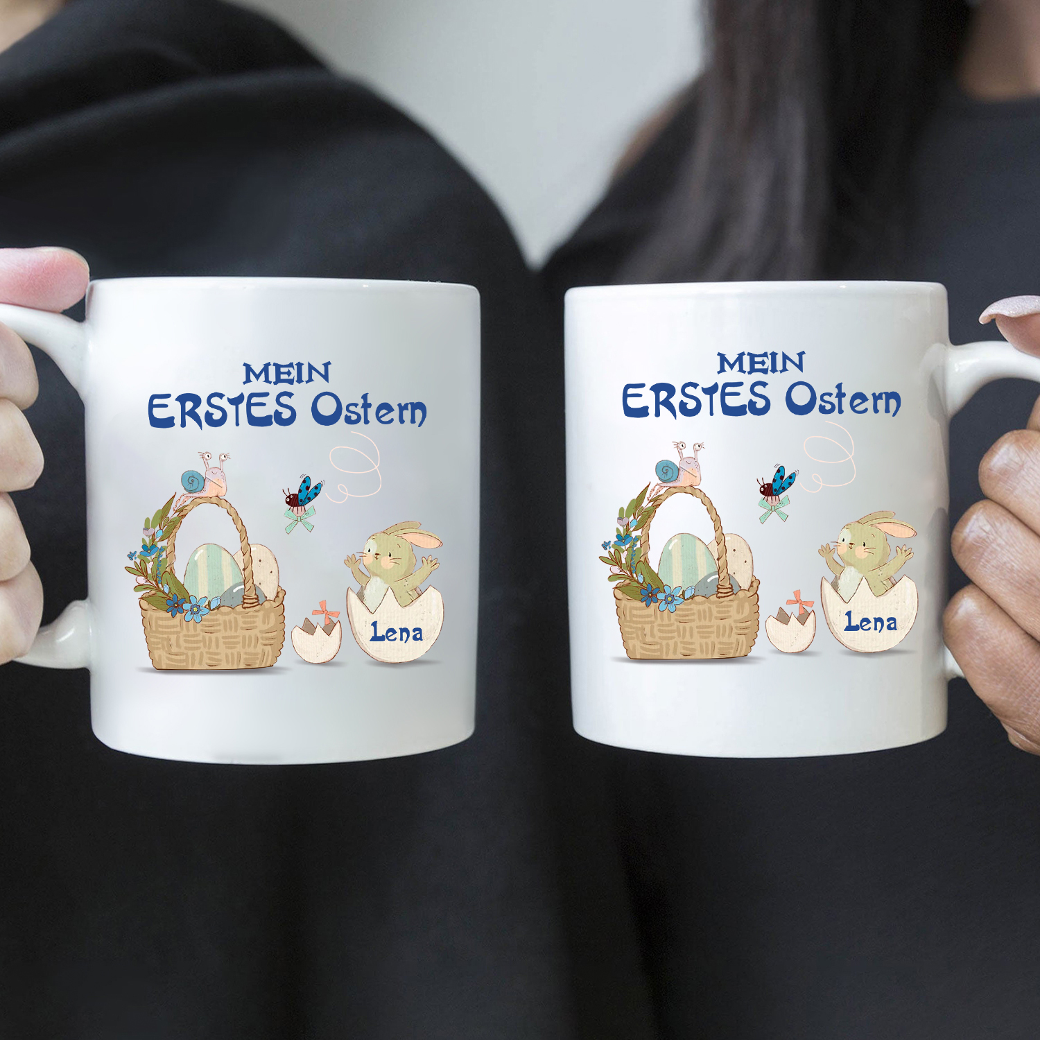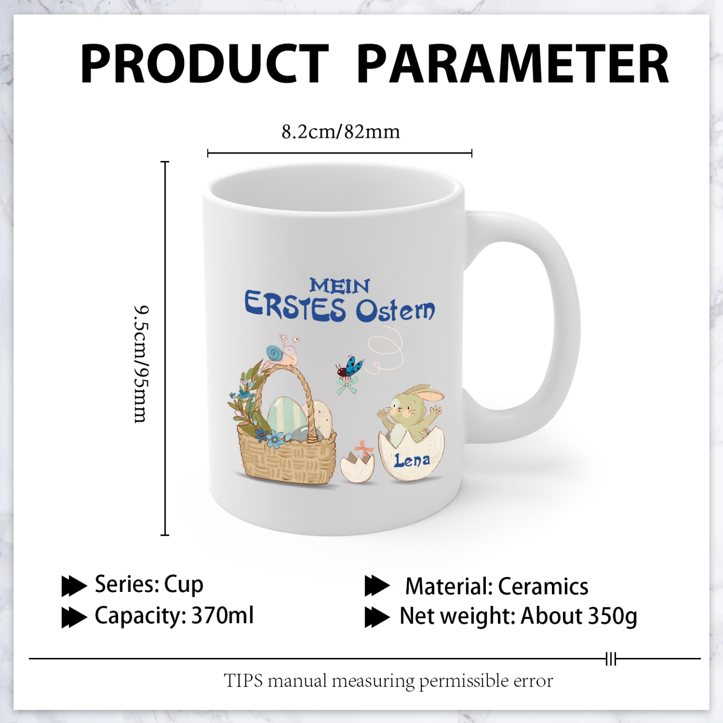 Tazza ceramica con coniglio blu personalizzata con 1 nome e 1 testo per Pasqua