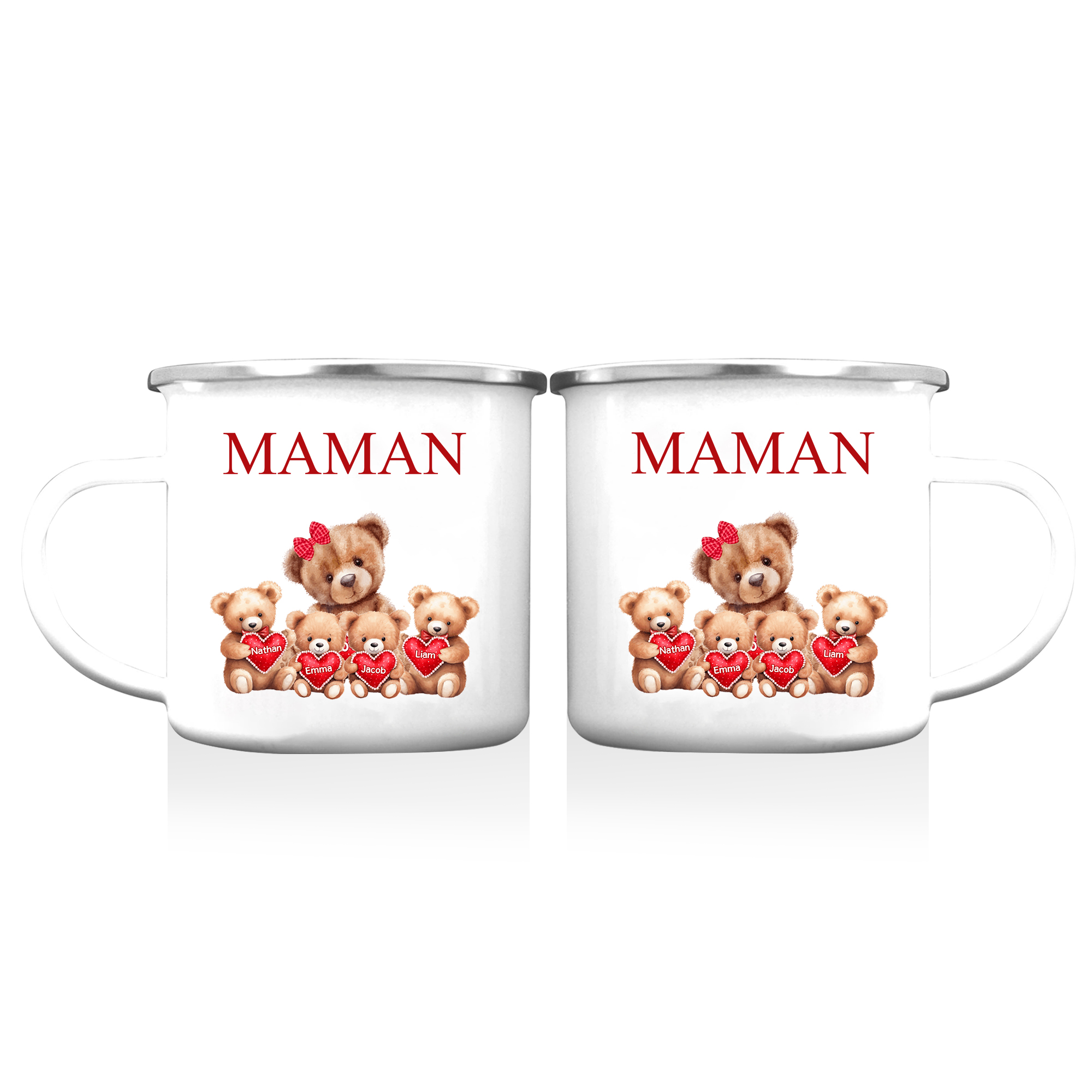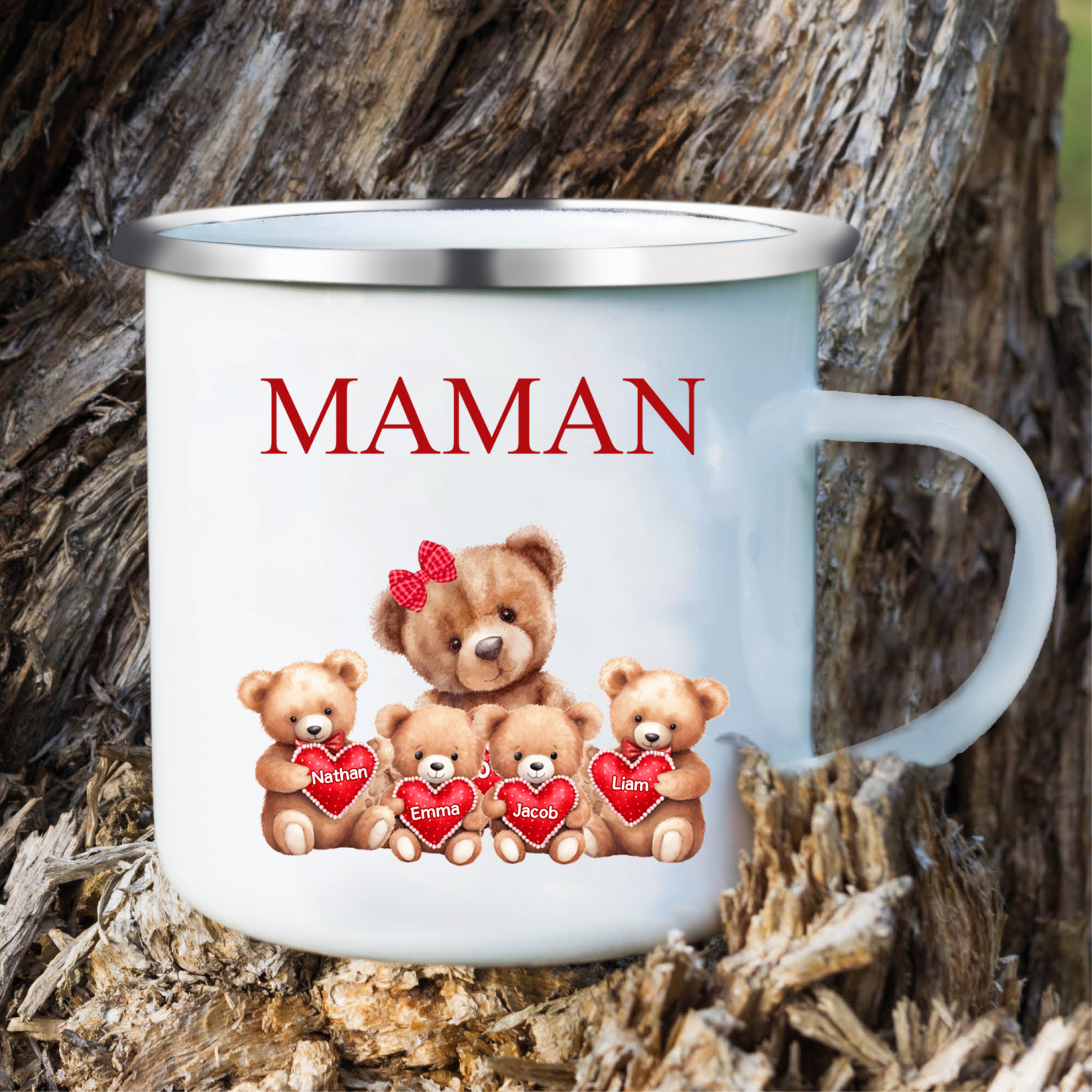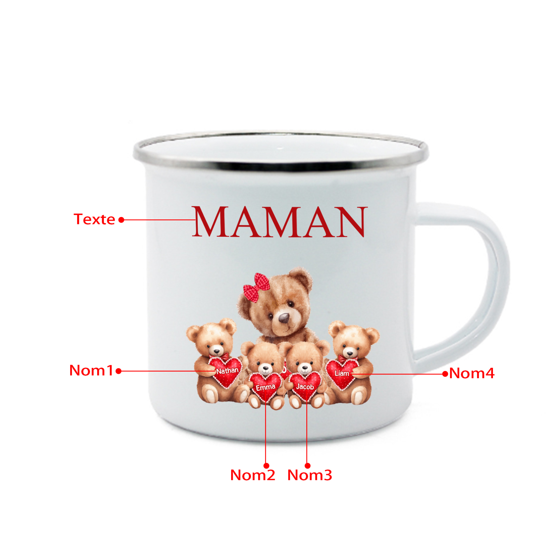Tazza ceramica con orsacchiotto personalizzata con 4 nomi e 1 testo
