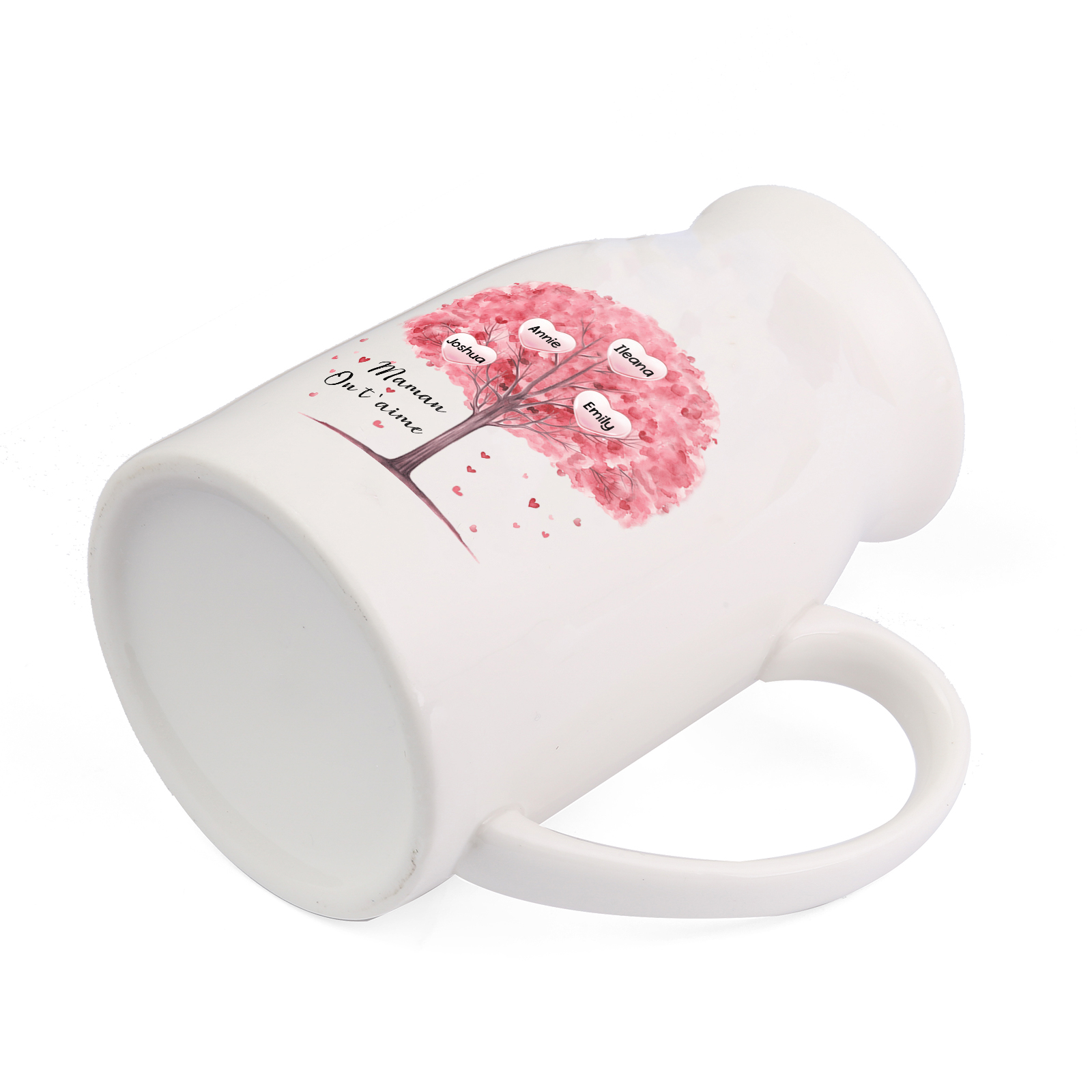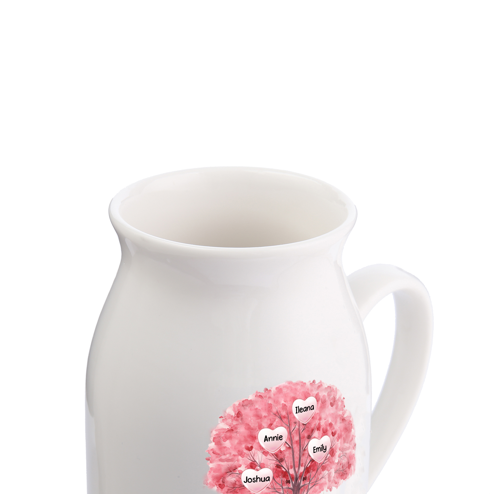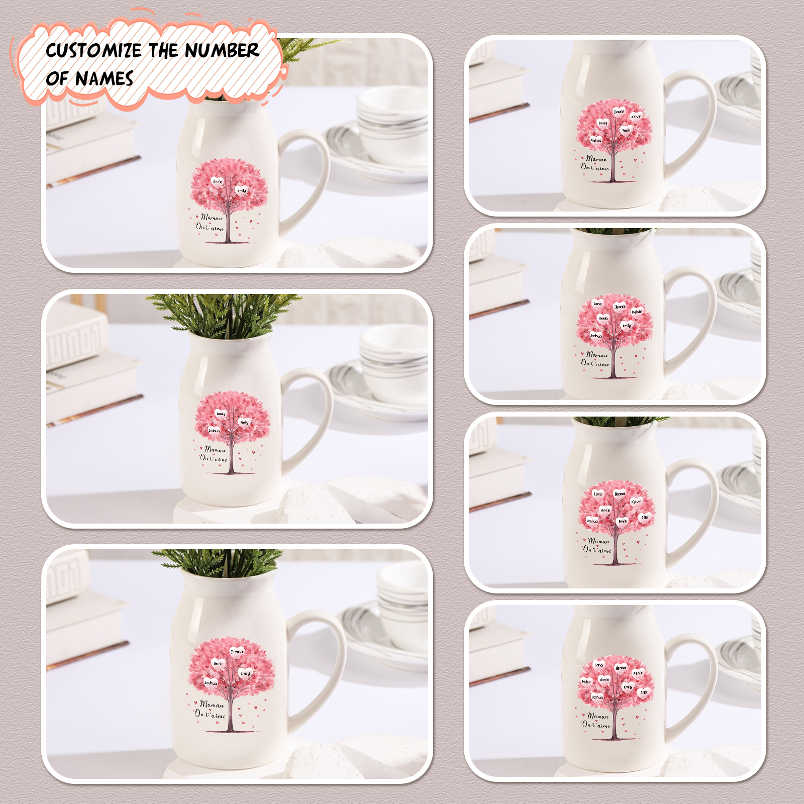 Vaso di ceramica con albero di cuore rosa 4 nomi e 1 testo personalizzati per mamma/nonna