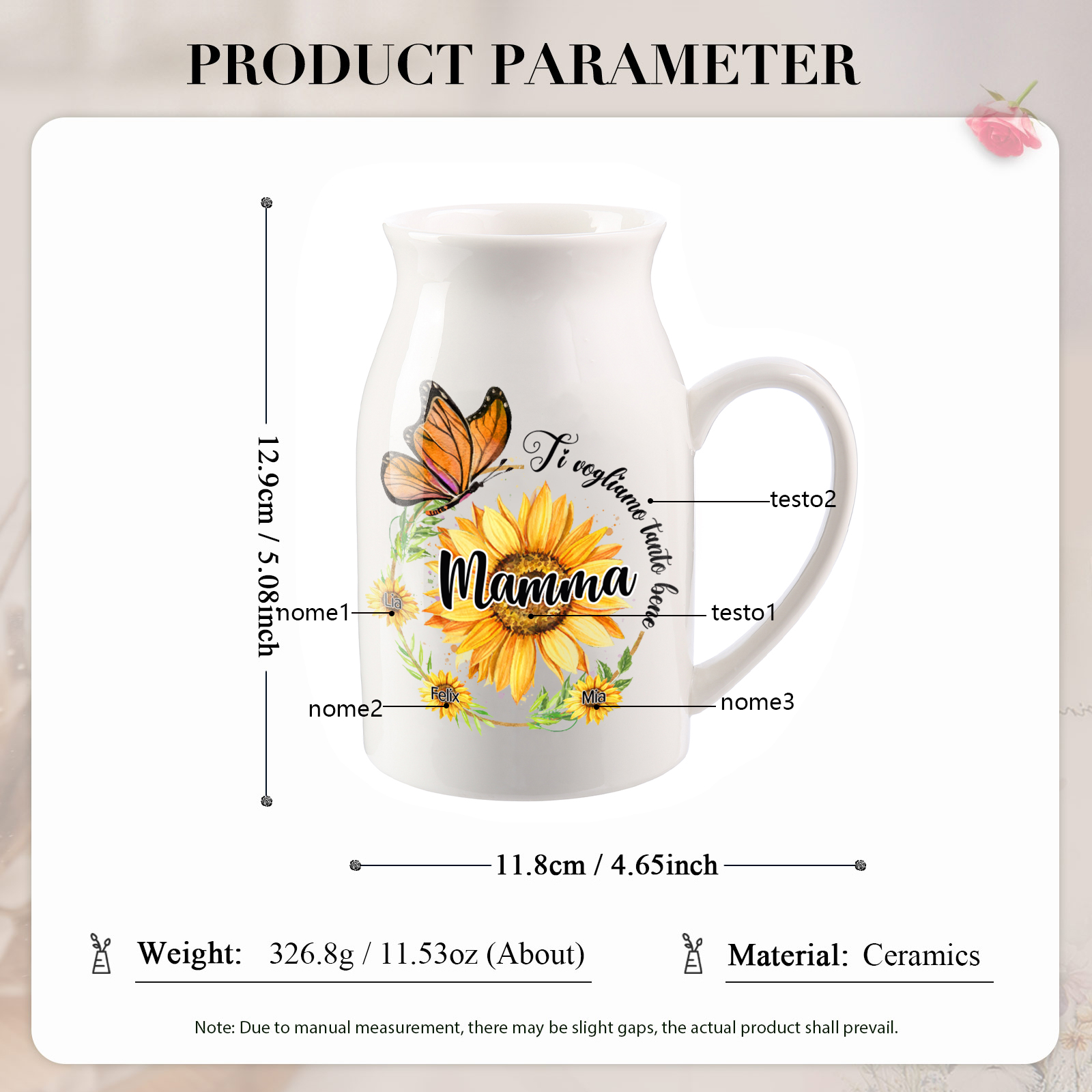 Vaso di ceramica mamma con girasole e farfalla personalizzato con 3 nomi e 2 testi per mamma/nonna