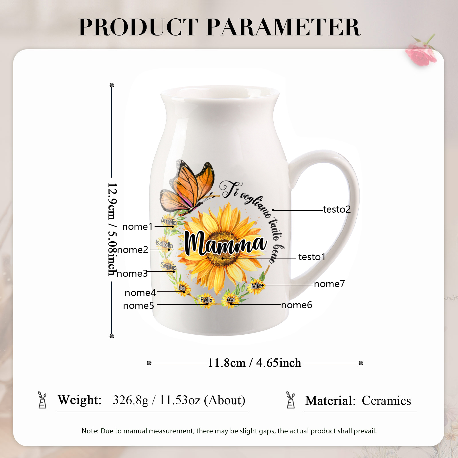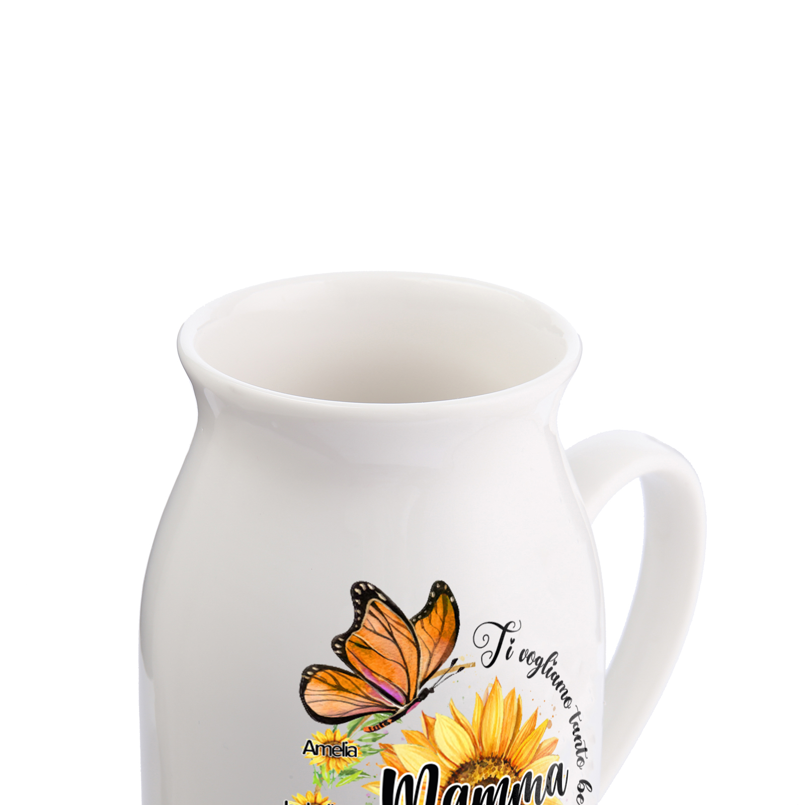 Vaso di ceramica mamma con girasole e farfalla personalizzato con 7 nomi e 2 testi per mamma/nonna