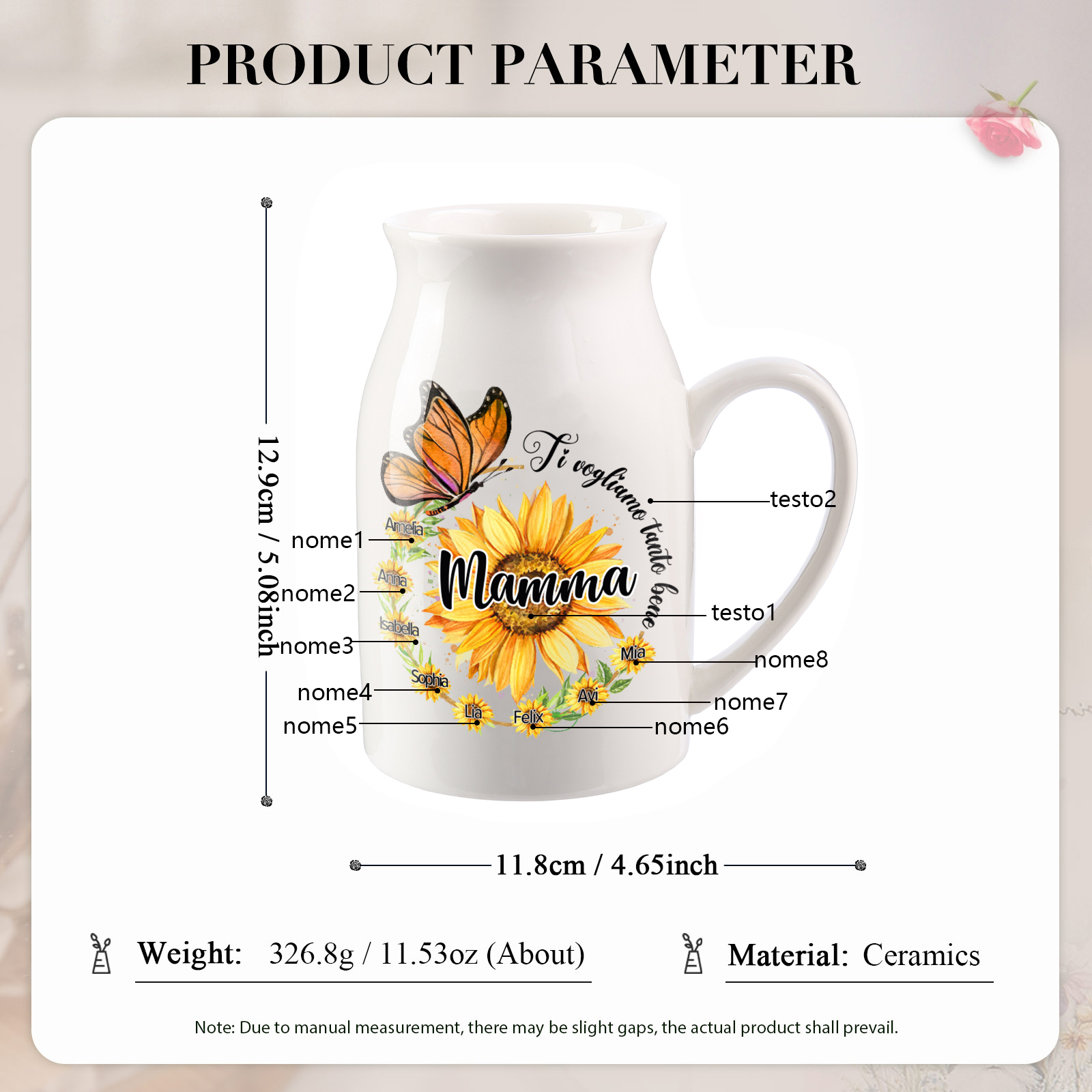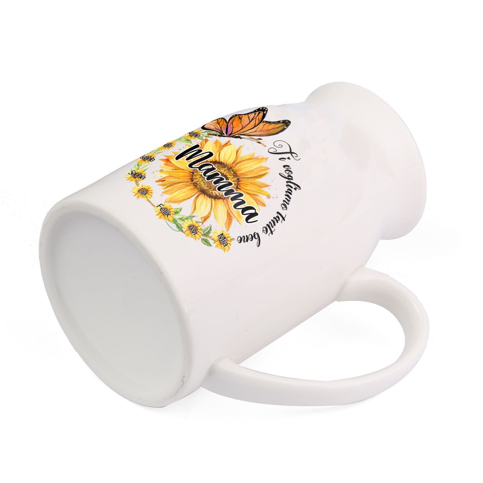 Vaso di ceramica mamma con girasole e farfalla personalizzato con 8 nomi e 2 testi per mamma/nonna