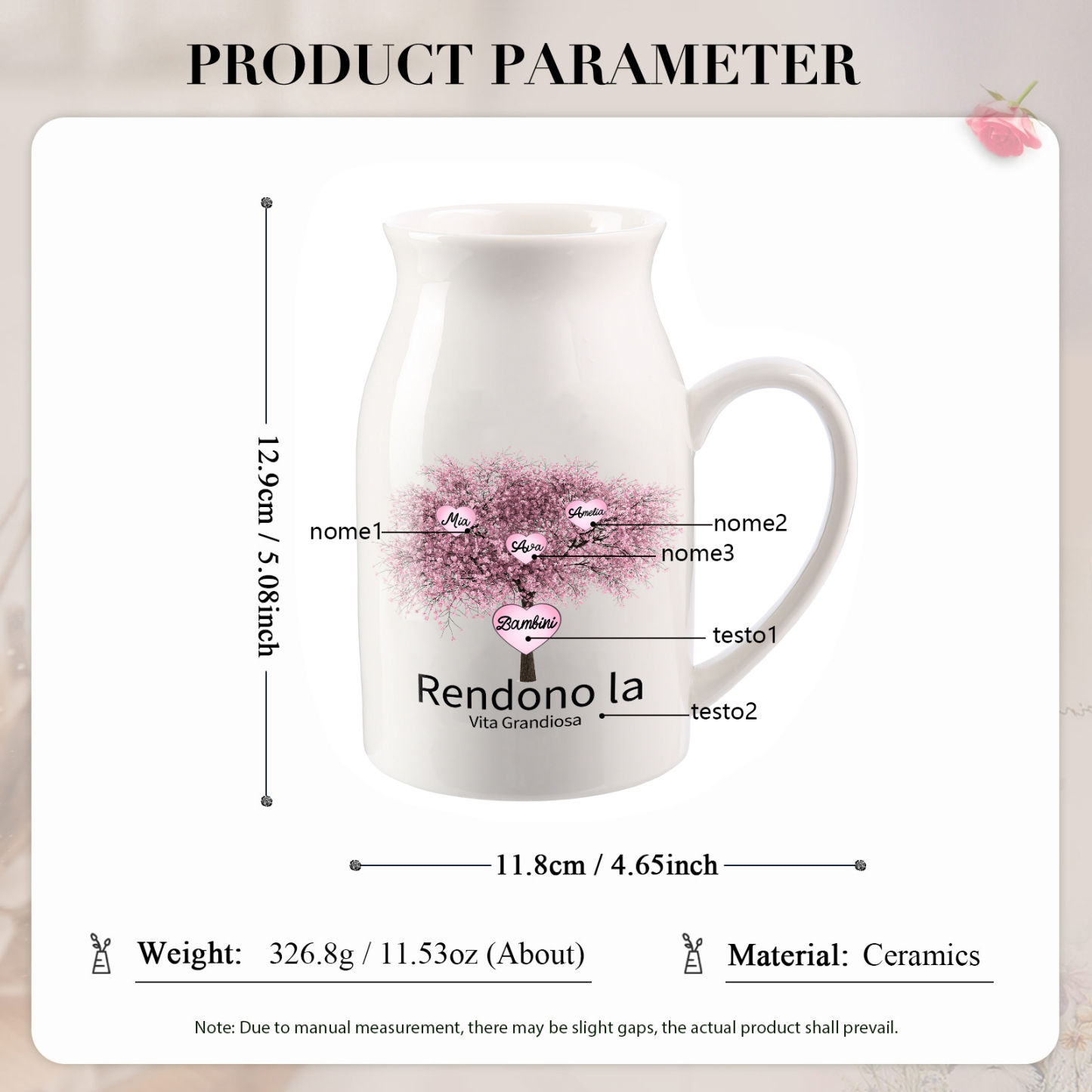 Vaso di ceramica albero di fiore rosa personalizzato con 3 nomi e 2 testi per mamma/nonna