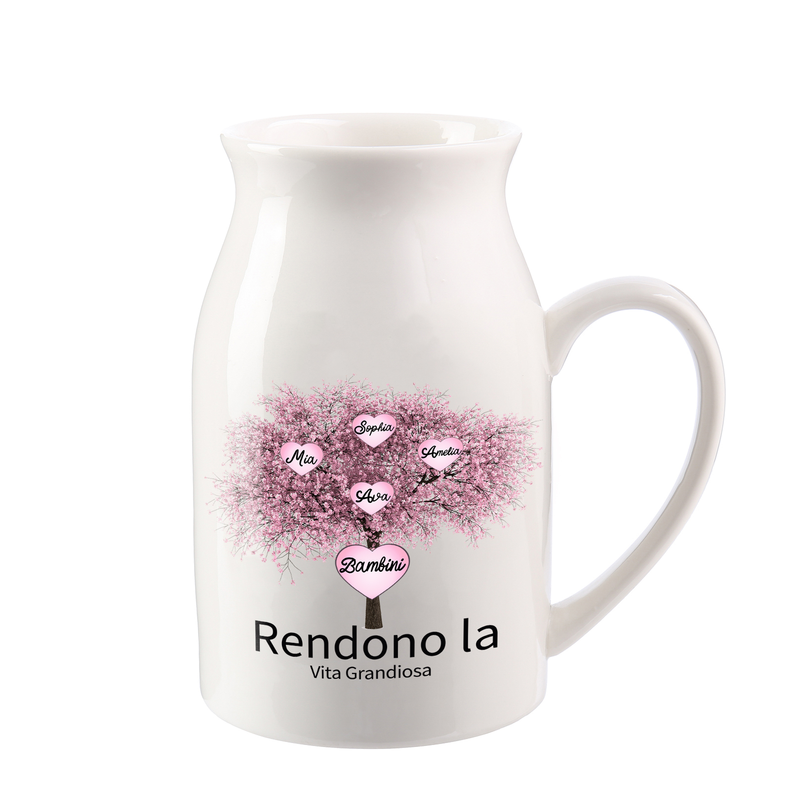 Vaso di ceramica albero di fiore rosa personalizzato con 4 nomi e 2 testi per mamma/nonna