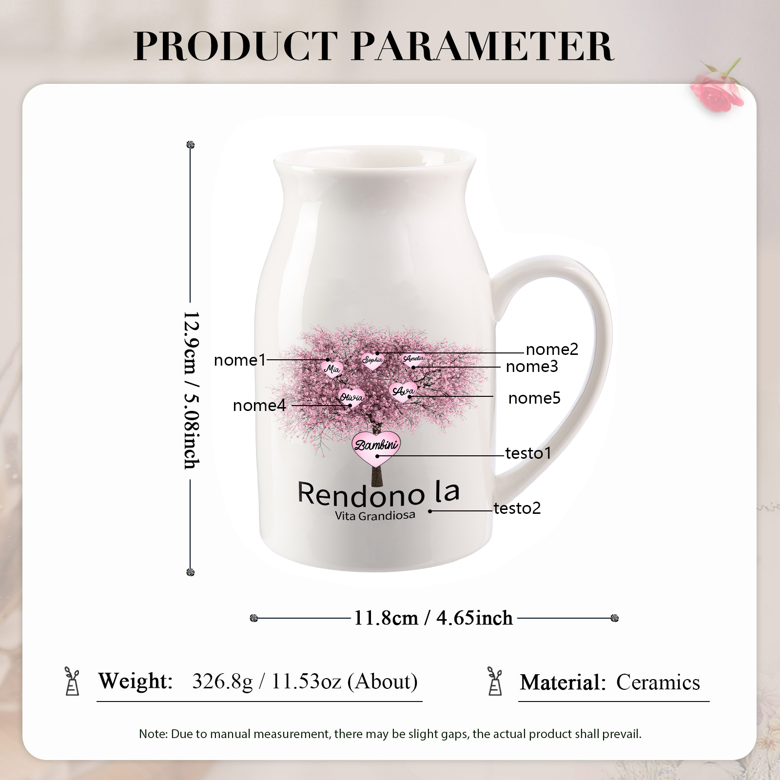 Vaso di ceramica albero di fiore rosa personalizzato con 5 nomi e 2 testi per mamma/nonna