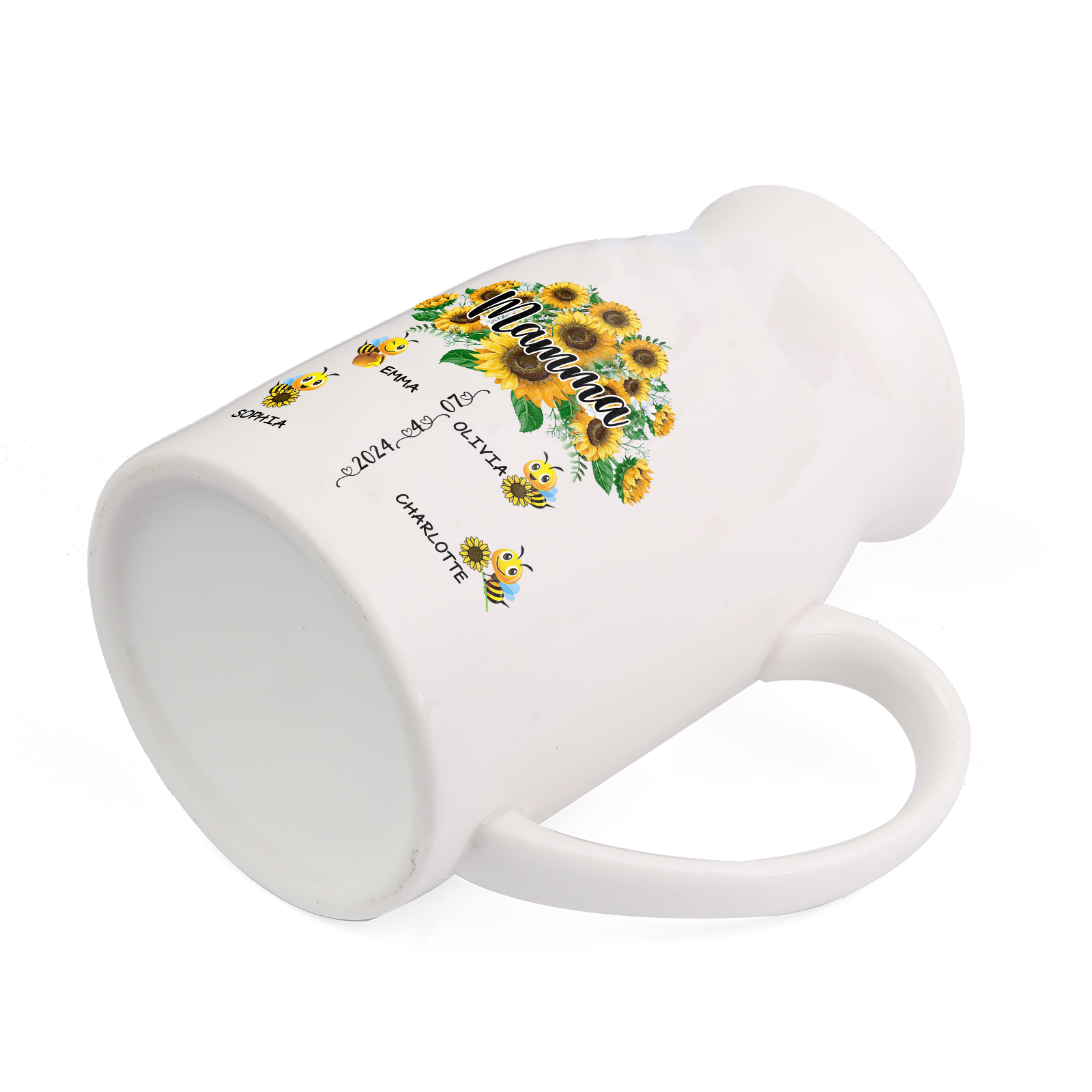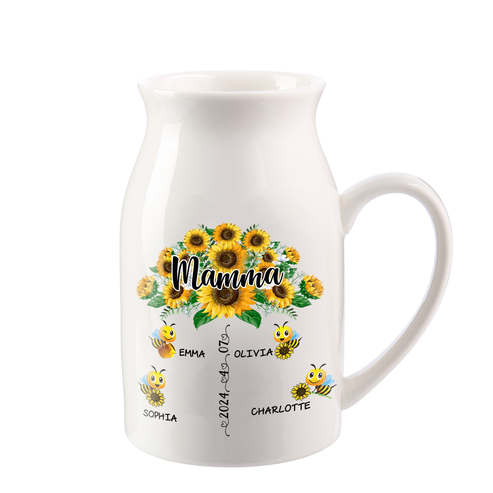 Vaso di ceramica mamma girasole personalizzato con 4 nomi e 1 testo e 1 data per mamma/nonna