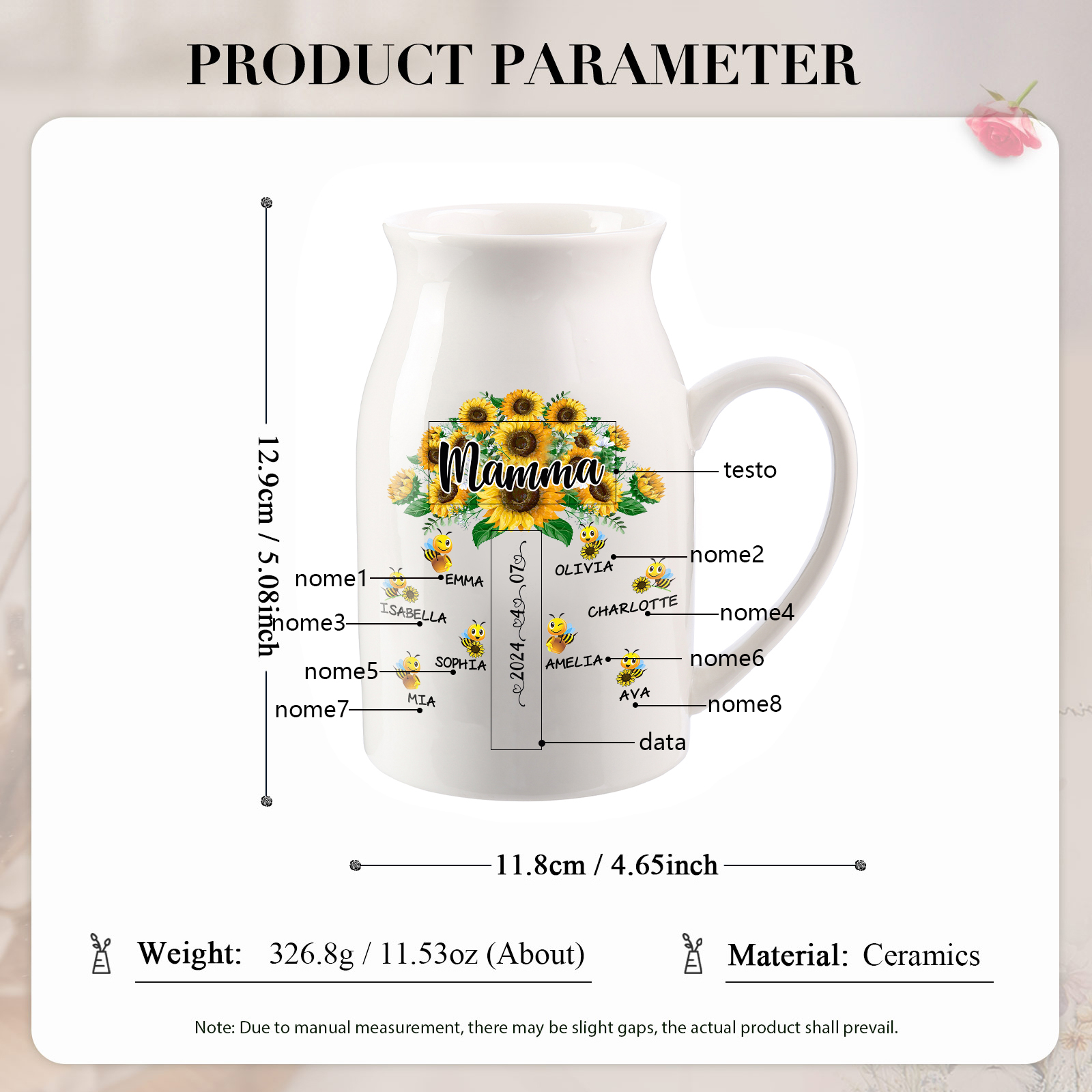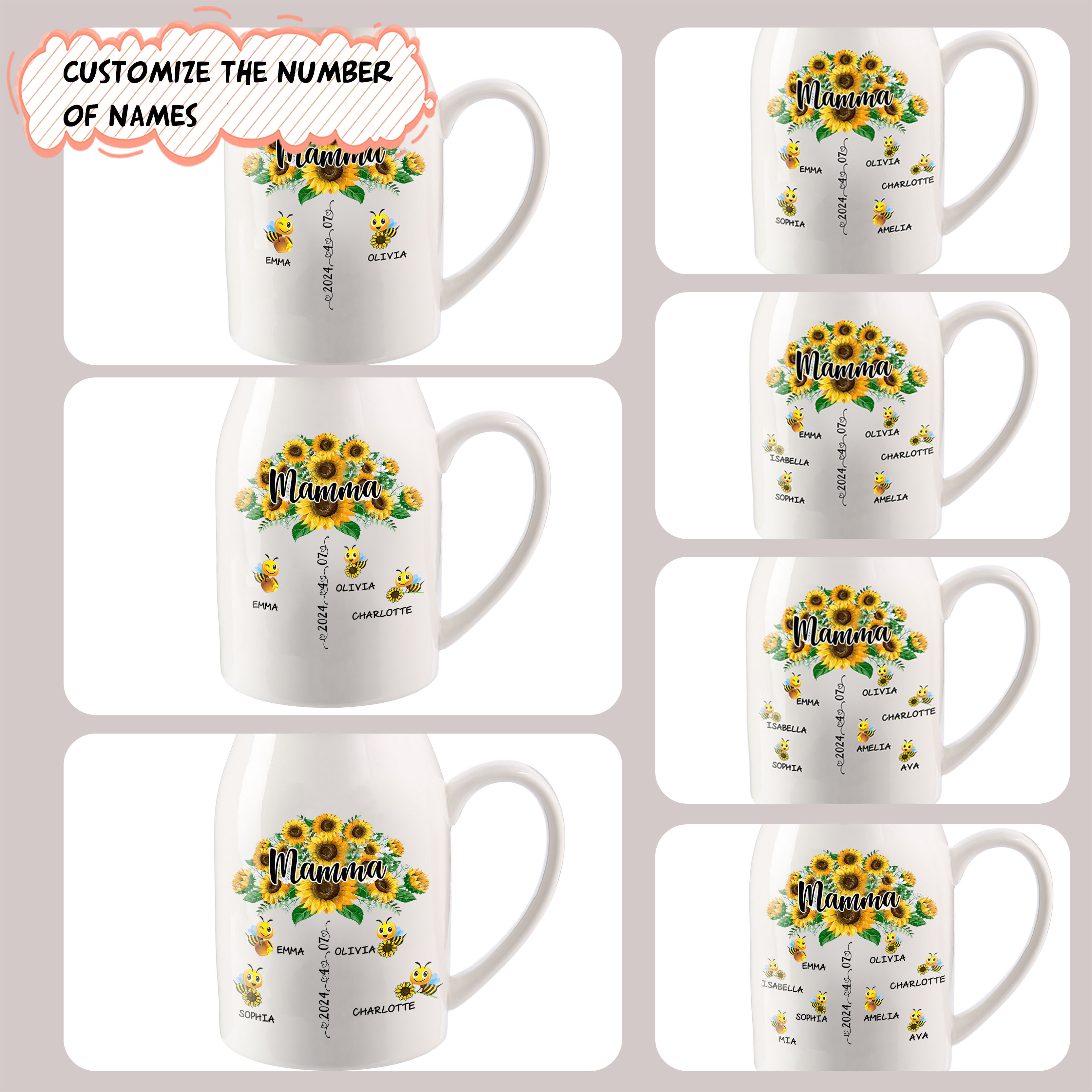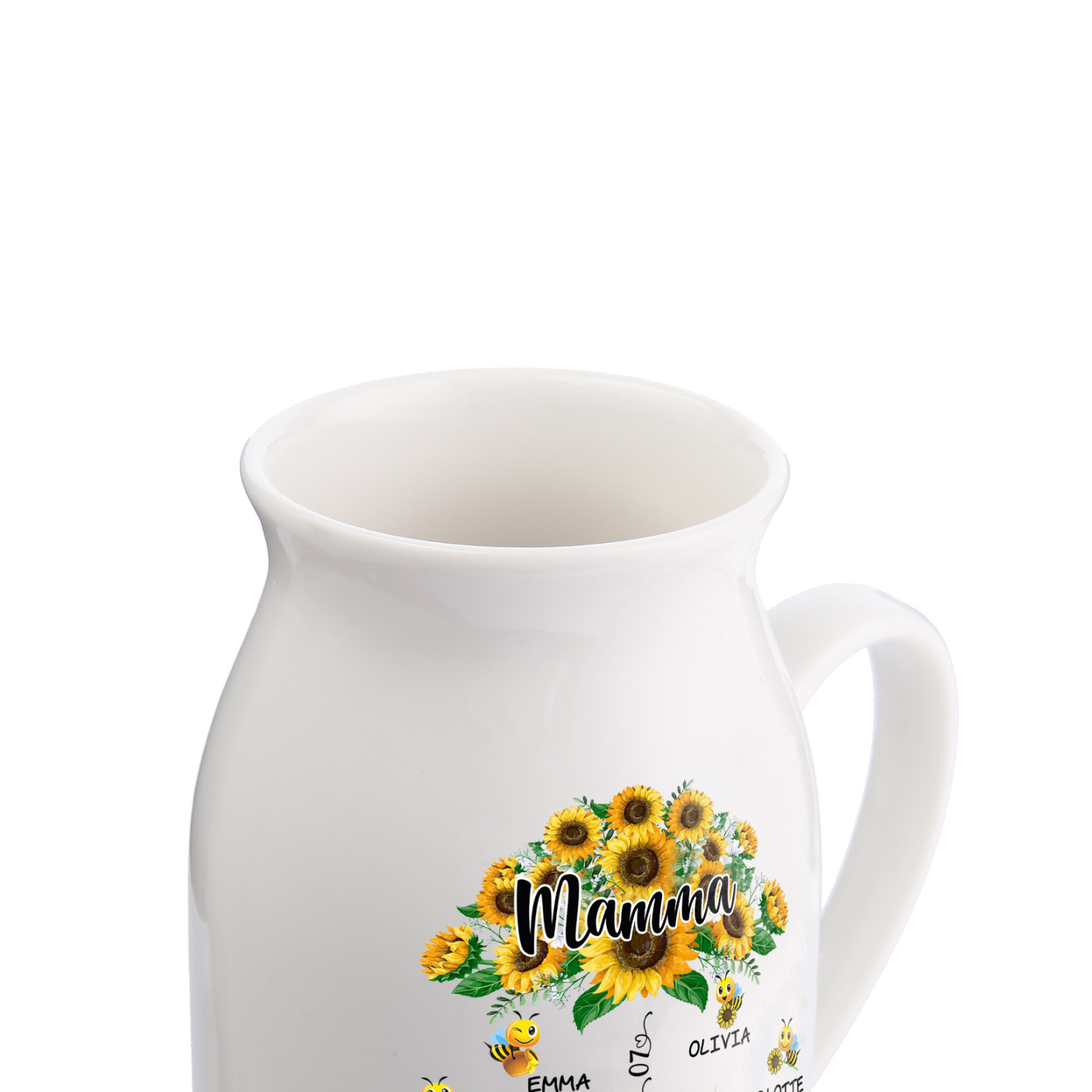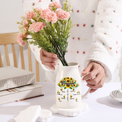 Vaso di ceramica mamma girasole personalizzato con 8 nomi e 1 testo e 1 data per mamma/nonna