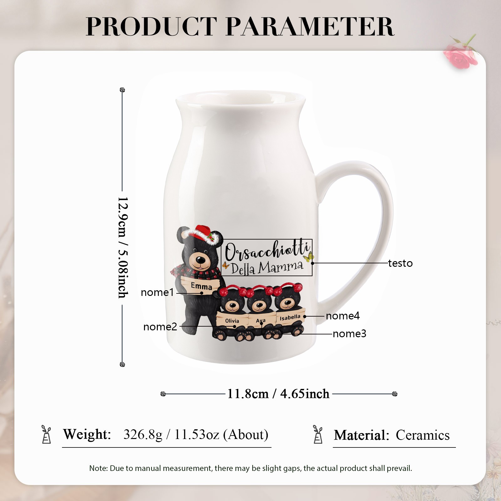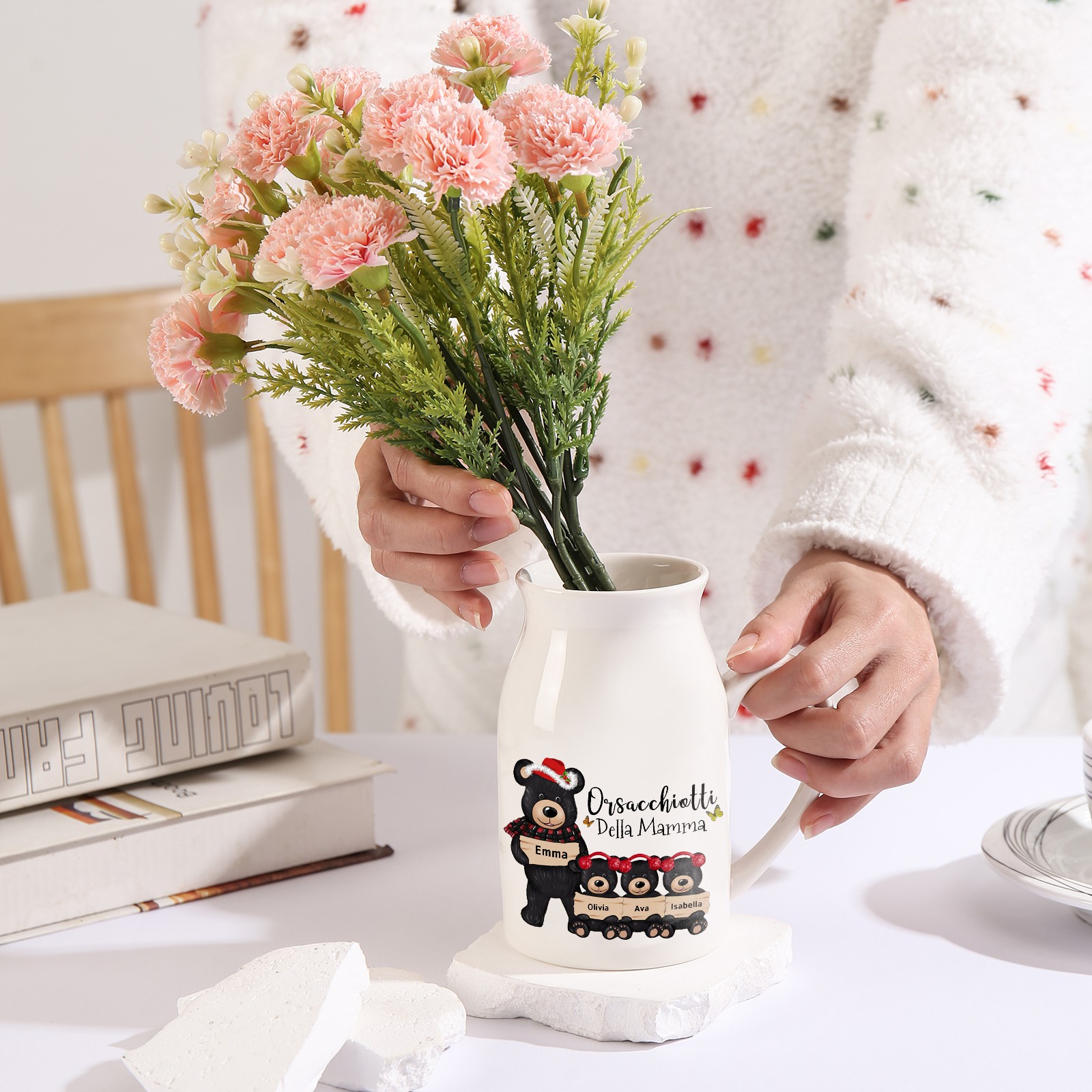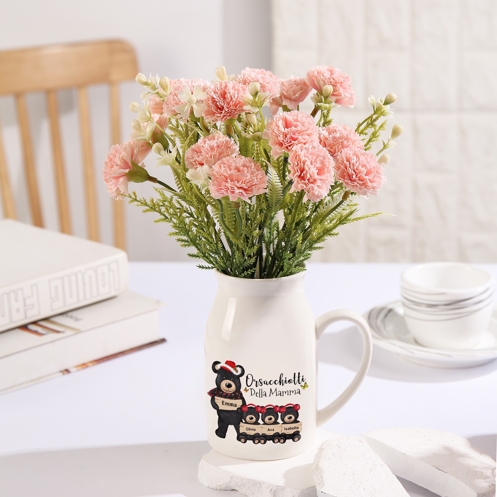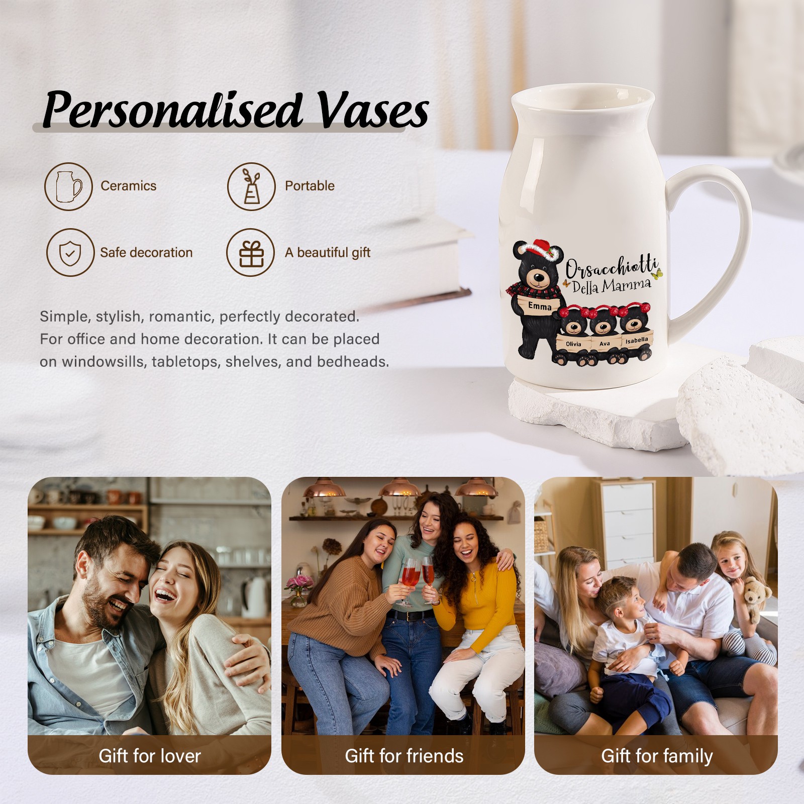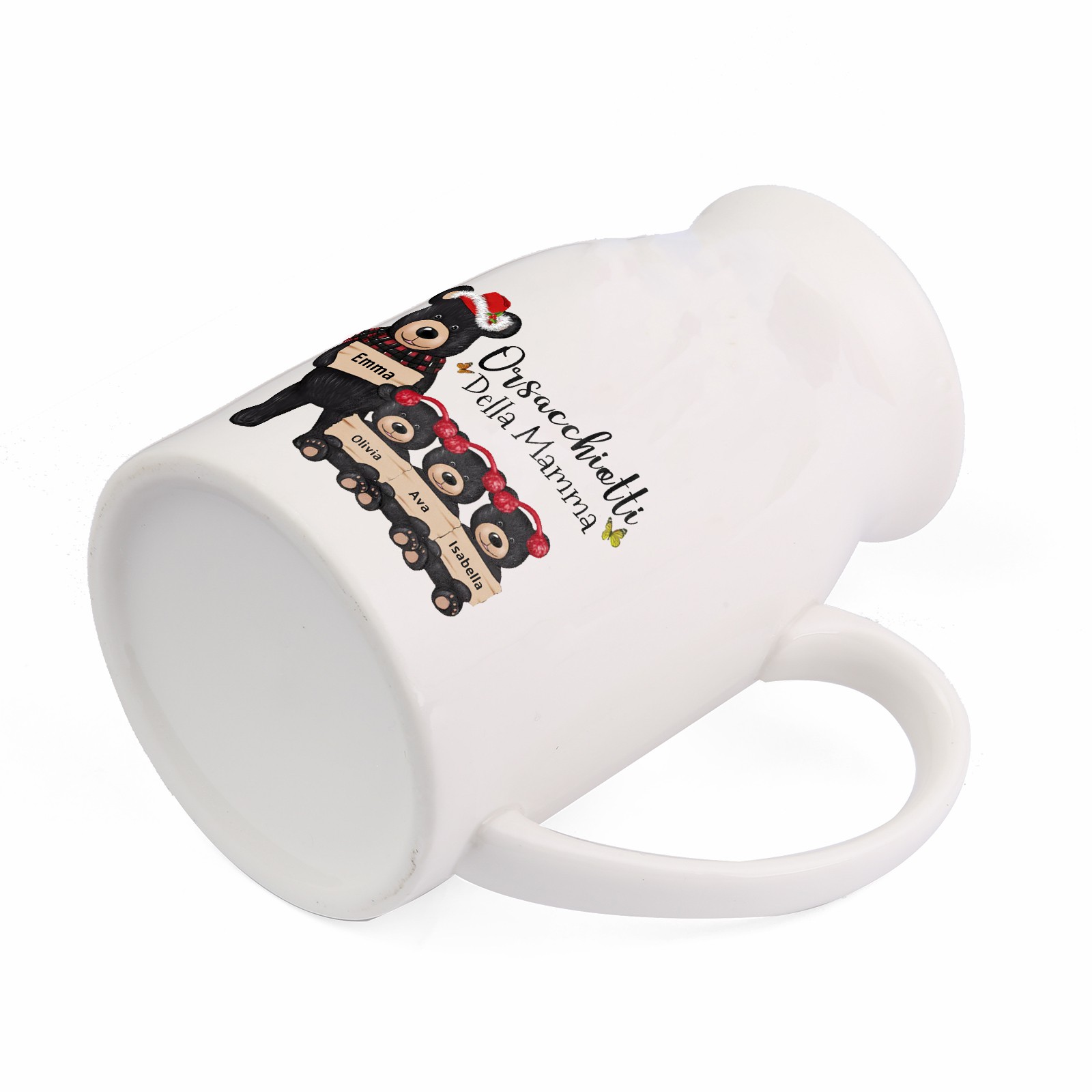 Vaso di ceramica mamma orso nero personalizzato con 4 nomi e 1 testo per mamma/nonna