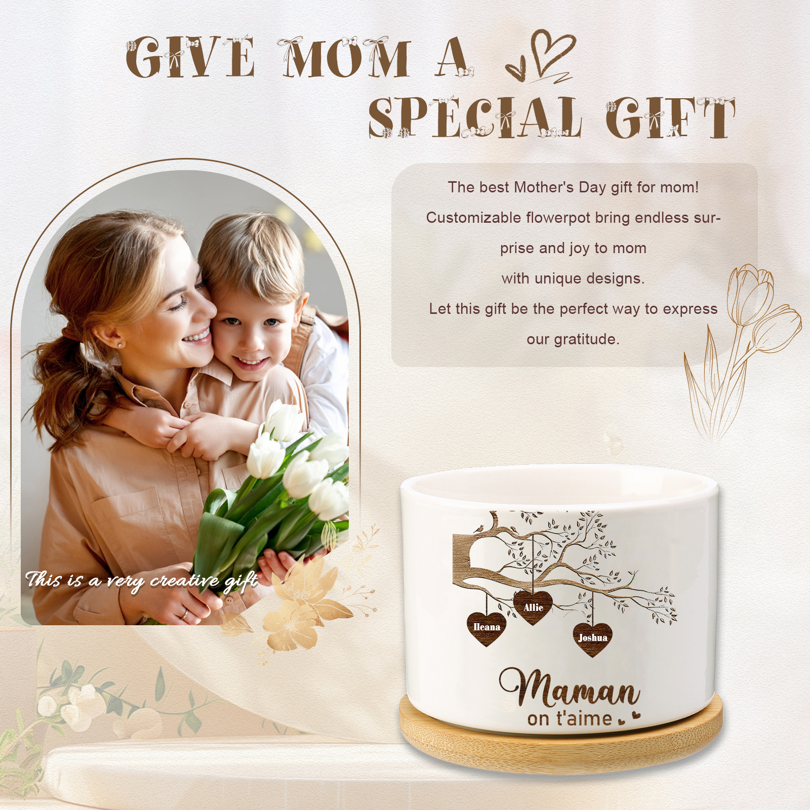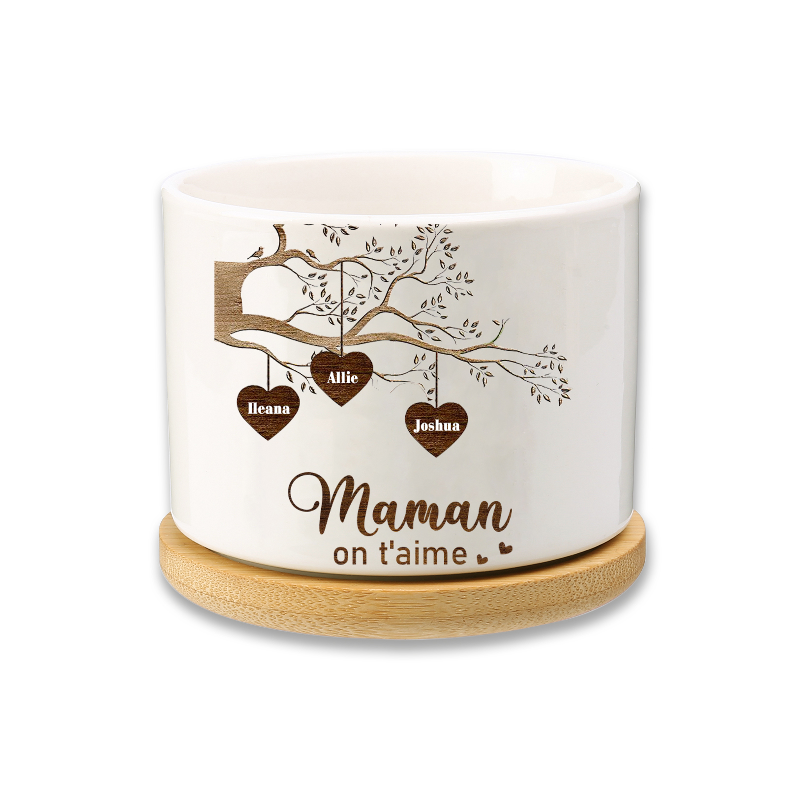 Vaso per fiori mamma albero e cuore personalizzato con 3 nomi e 1 testo per famiglia