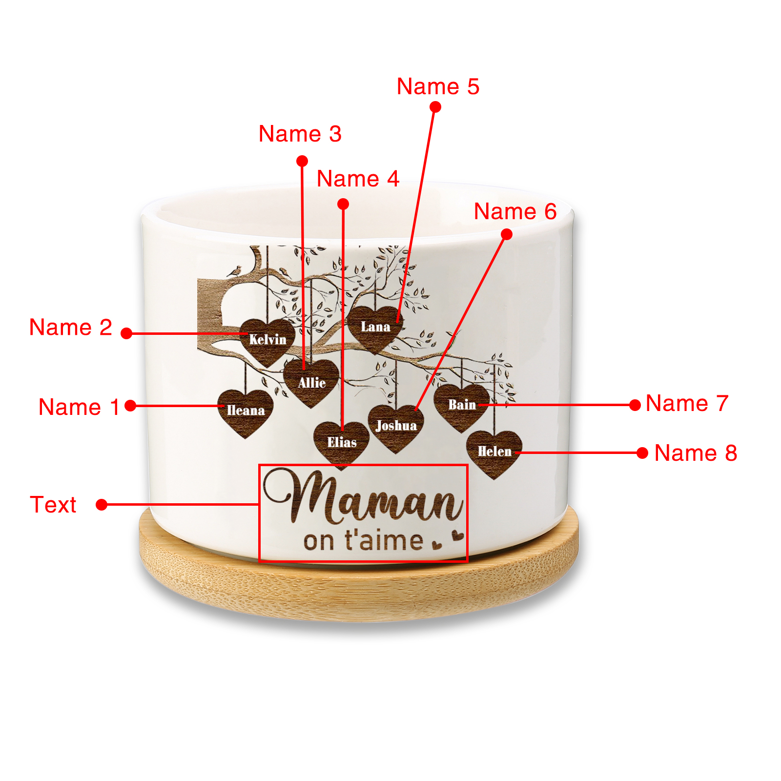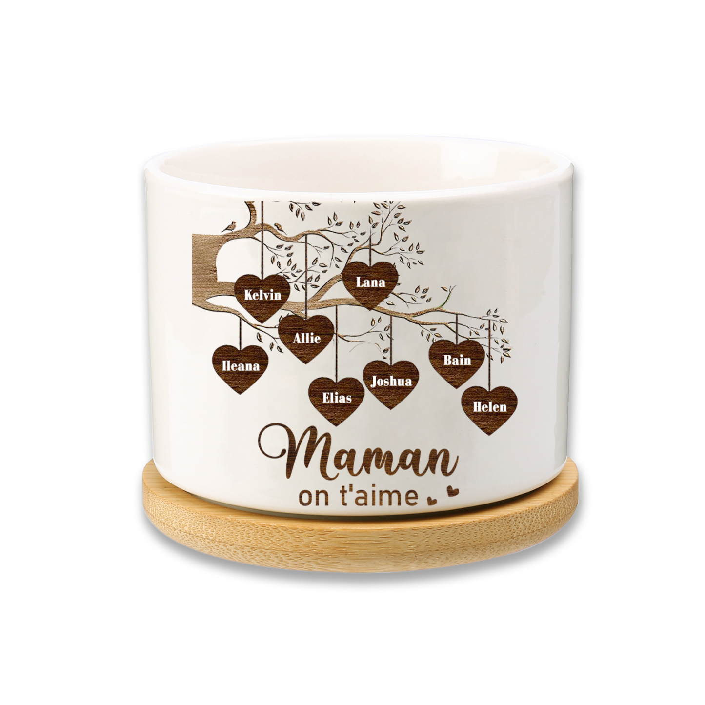 Vaso per fiori mamma albero e cuore personalizzato con 8 nomi e 1 testo per famiglia
