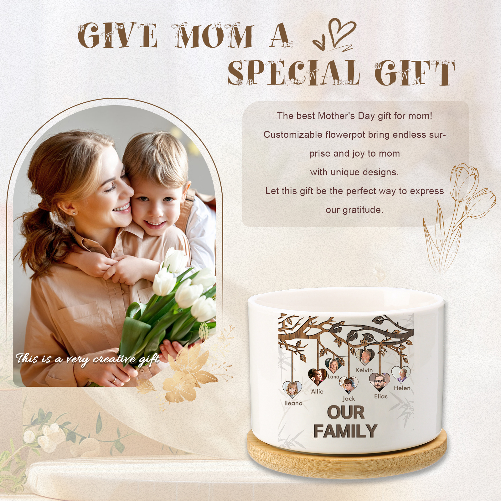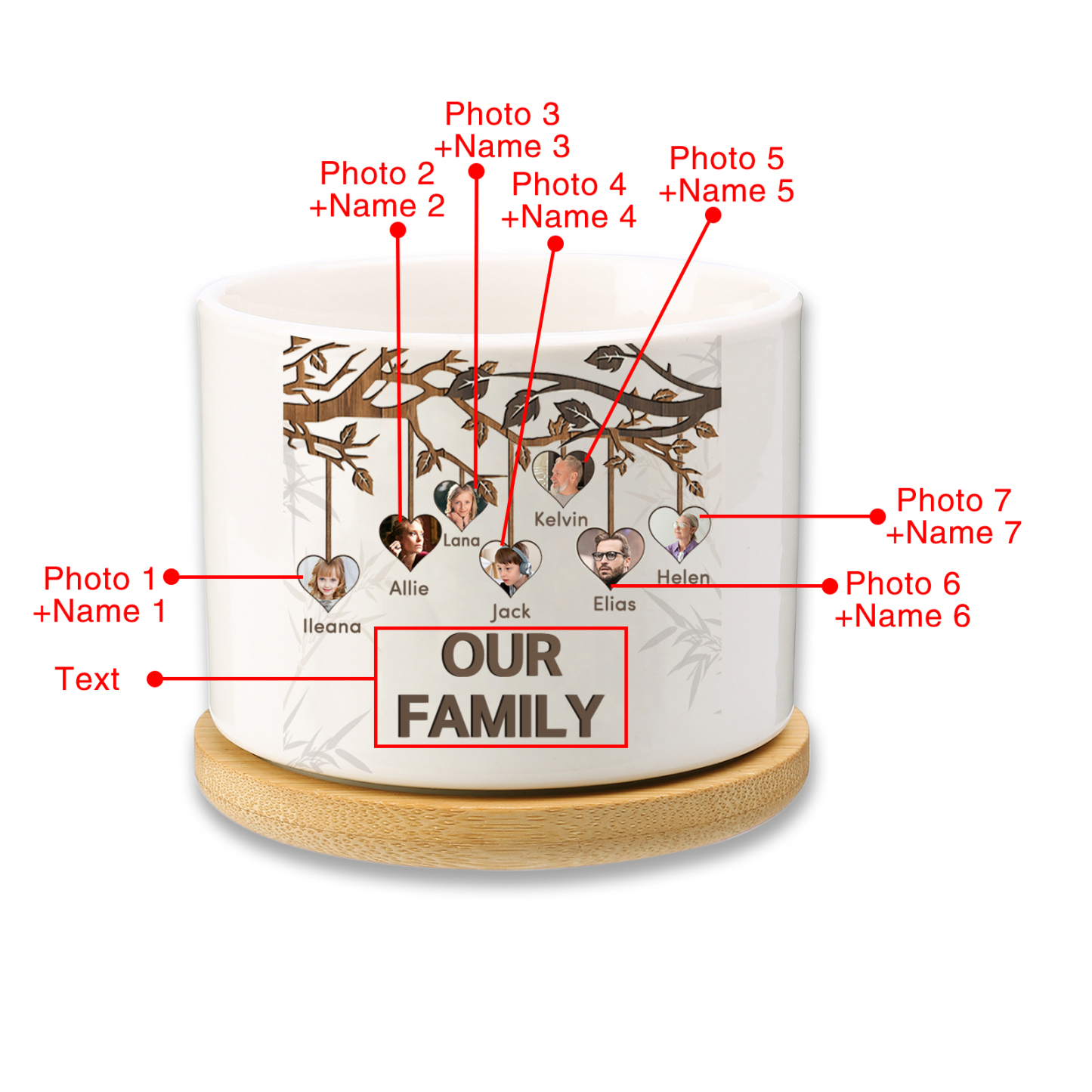 Vaso per fiori mamma albero di vita personalizzato con 7 foto e 7 nomi e 1 testo per famiglia